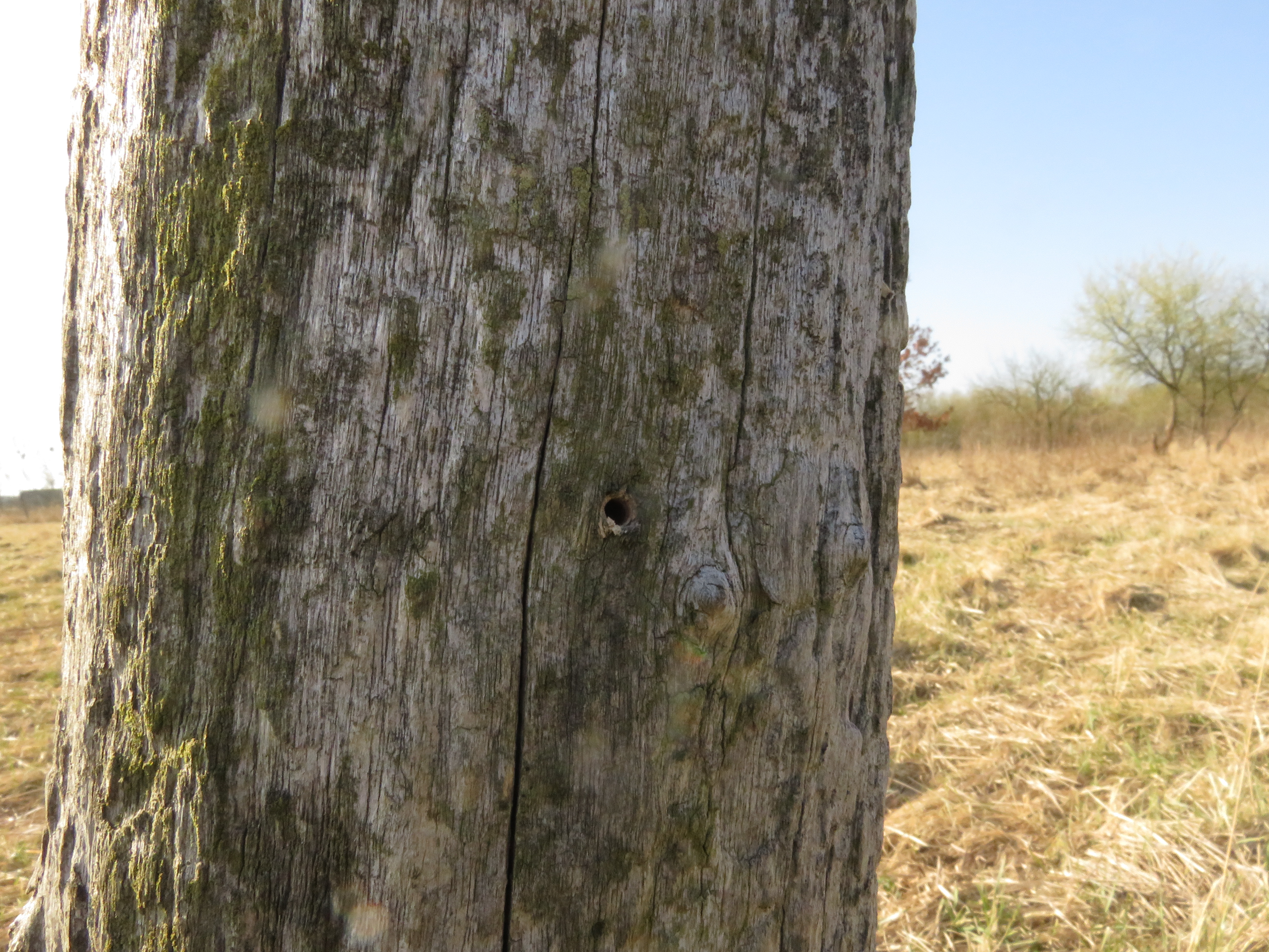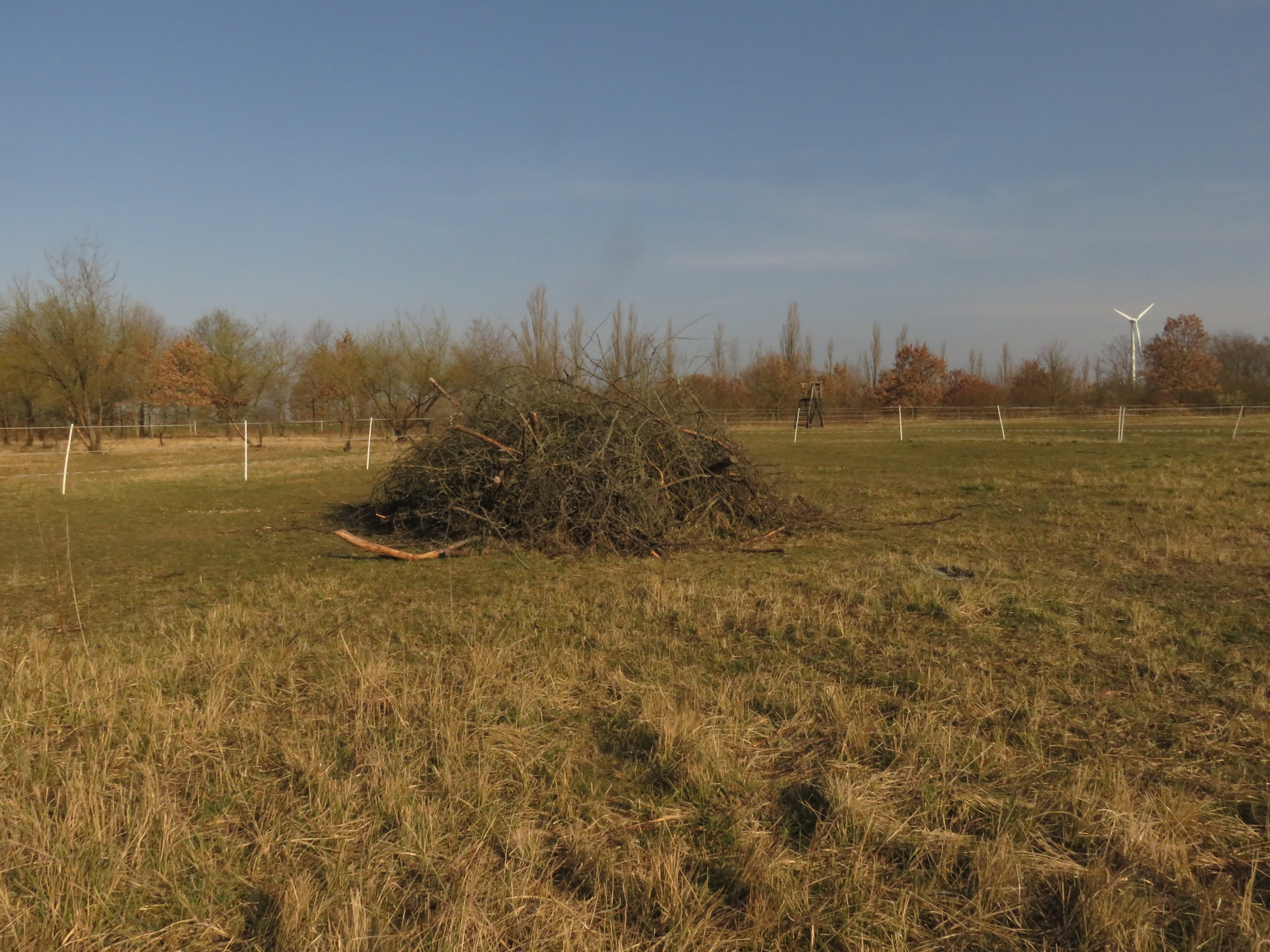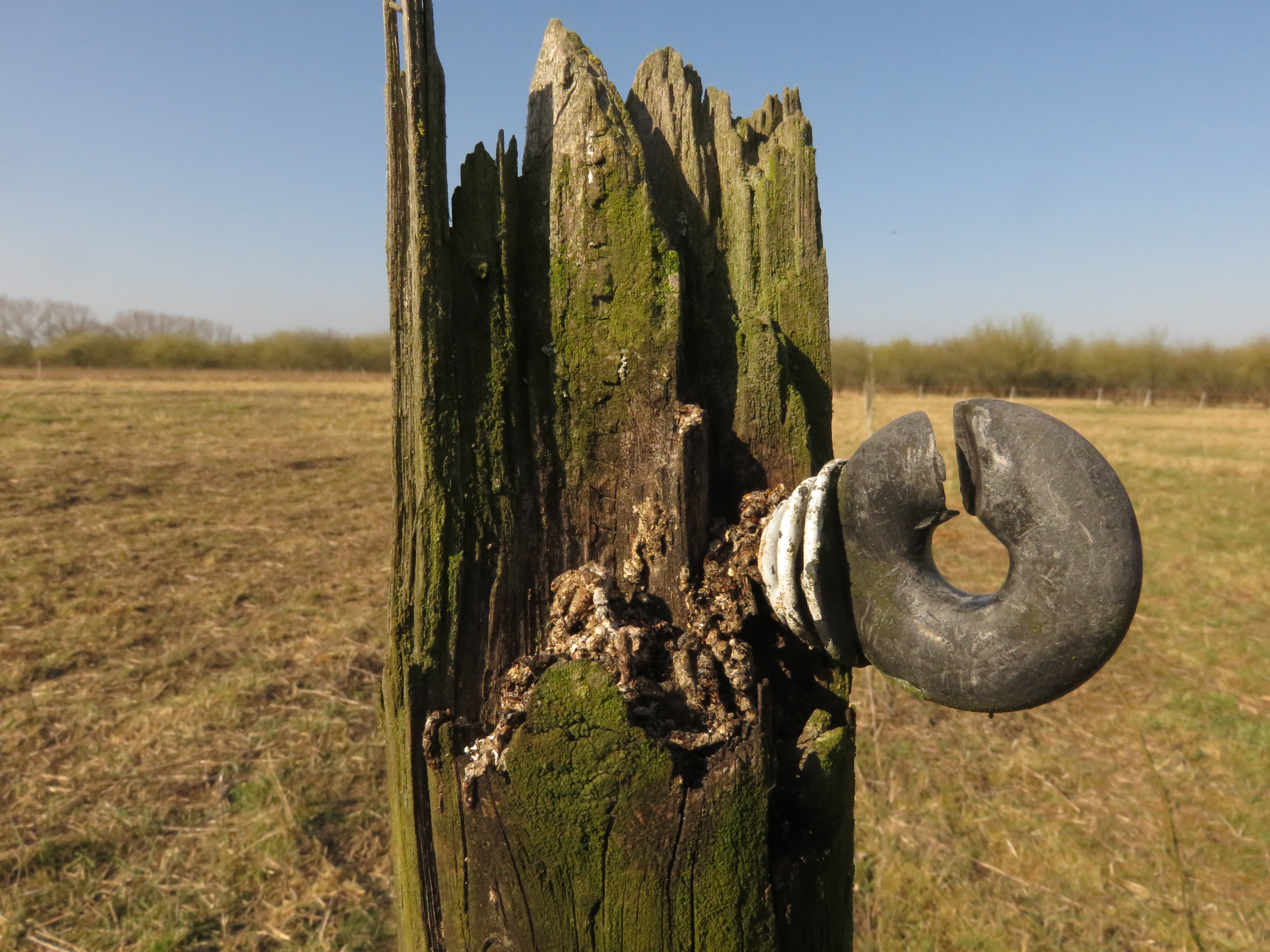 Einen alten Zaun, der nicht mehr gebraucht wird und ehrlich gesagt auch nicht mehr zu gebrauchen war, habe ich heute abgebaut. Aber die alten Holzpfosten, die noch standfest sind habe ich stehen lassen. Daran können sich die Pferde schubbern und Vögel nutzen solche vertikalen Strukturen gern als Ansitz- und Singwarte. Wie man auf einem der folgenden Bilder am reichlichen Vogelkot sehen kann. Nur die Ringisolatoren habe ich entfernt, damit sich die Pferde nicht daran verletzen können und vielleicht bieten sie solitären Wildbienen Unterschlupf? Das werde ich im Auge behalten und berichten, ob diese Löcher angenommen werden. Auf jeden Fall können sich zahlreiche Insekten in den Löchern und Rissen tummeln…