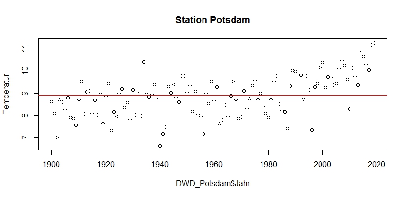 Folgende Grafik zeigt die Auswertung der Jahresmittelwerte der Temperatur der Klimastation Potsdam. Die Daten können beim DWD runtergeladen werden. Die Linie zeigt den langjährigen Mittelwert von 8,9°C.