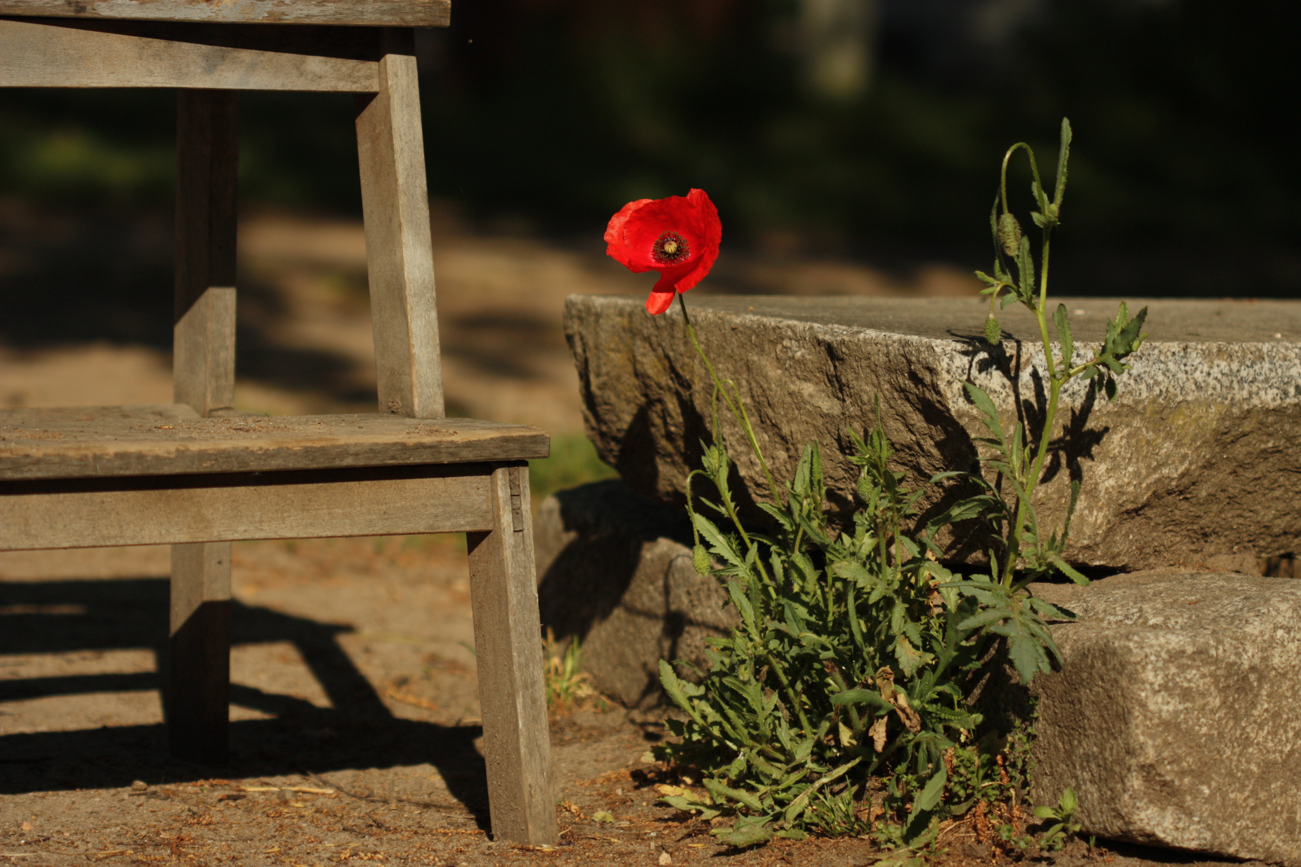 Und dann – wenn man mal etwas inne hält, sich selbst kurz zurück nimmt, aufhört hektisch über den Hof zu rennen, um noch dieses oder jenes zu schaffen, kann man sich an den kleinen Dingen erfreuen. Wie eine Mohnblume wunderschön und frech neben einer Sitzbank von selbst aufgewachsen ist.