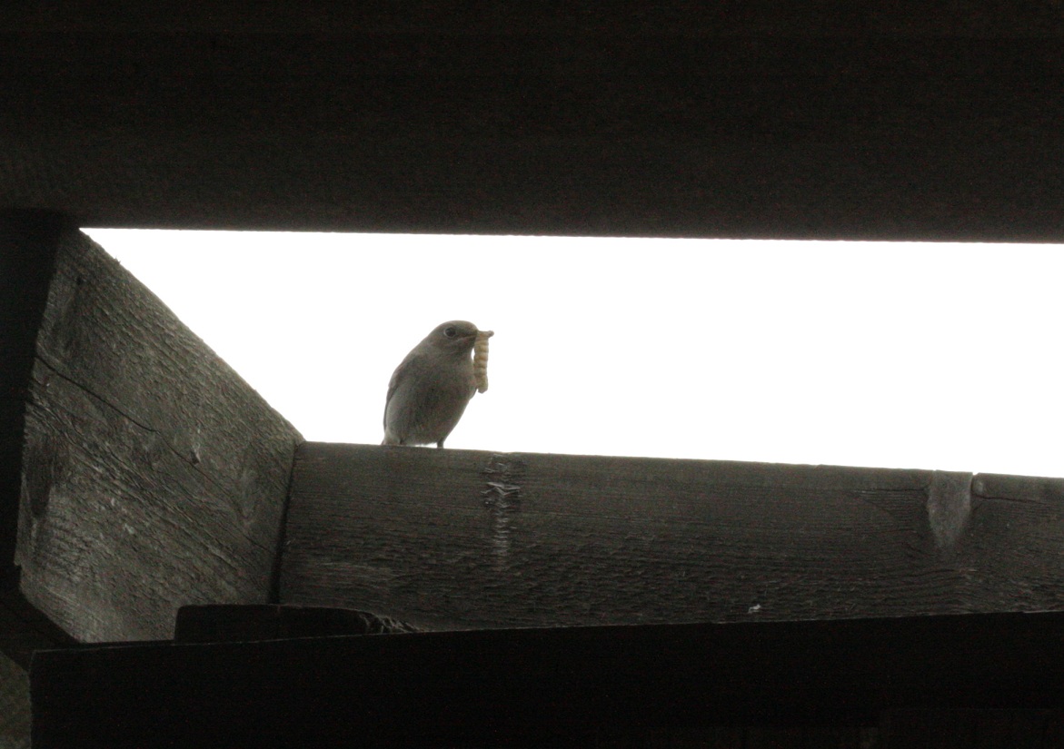 Unser Hausrotschwänzchen ist fleißig dabei seine Jungen zu füttern. Gestern konnte ich es dabei beobachten, wie es eine besonders fette Raupe zum Nest getragen hat.