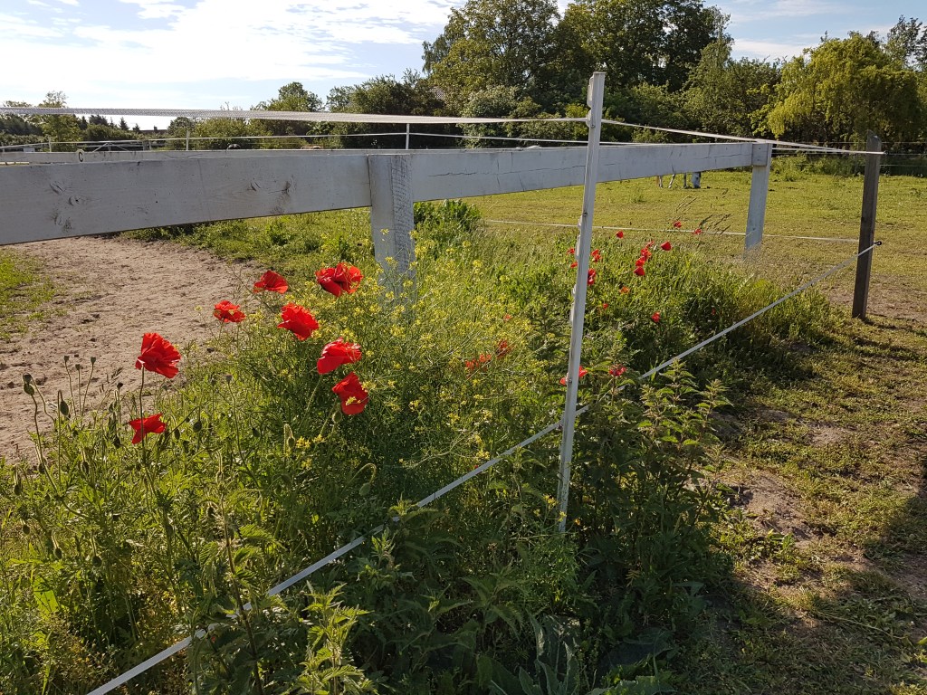 Wilde Ecken haben wir mehr als genug, im Prinzip sind unsere ganzen Weiden ziemlich wild. Bei uns ist eher die Herausforderung „einen Grund reinzukriegen“. Dennoch habe ich auch ein Bild aus Glindow mit einer „verlotterten Ecke“, nämlich auf dem Reitplatz. Hier wachsen hinter dem Hufschlag Mohnblumen, Wicken, Sauerampfer, Rainfarn, Beifuss, Brennnessel, Hirtentäschel, Erdrauch, Knaulgras, Weiche Trespe, Rispengras und sicher noch einiges mehr. Eine kleine Bienen- und Augenweide, die sich selbst etabliert hat.