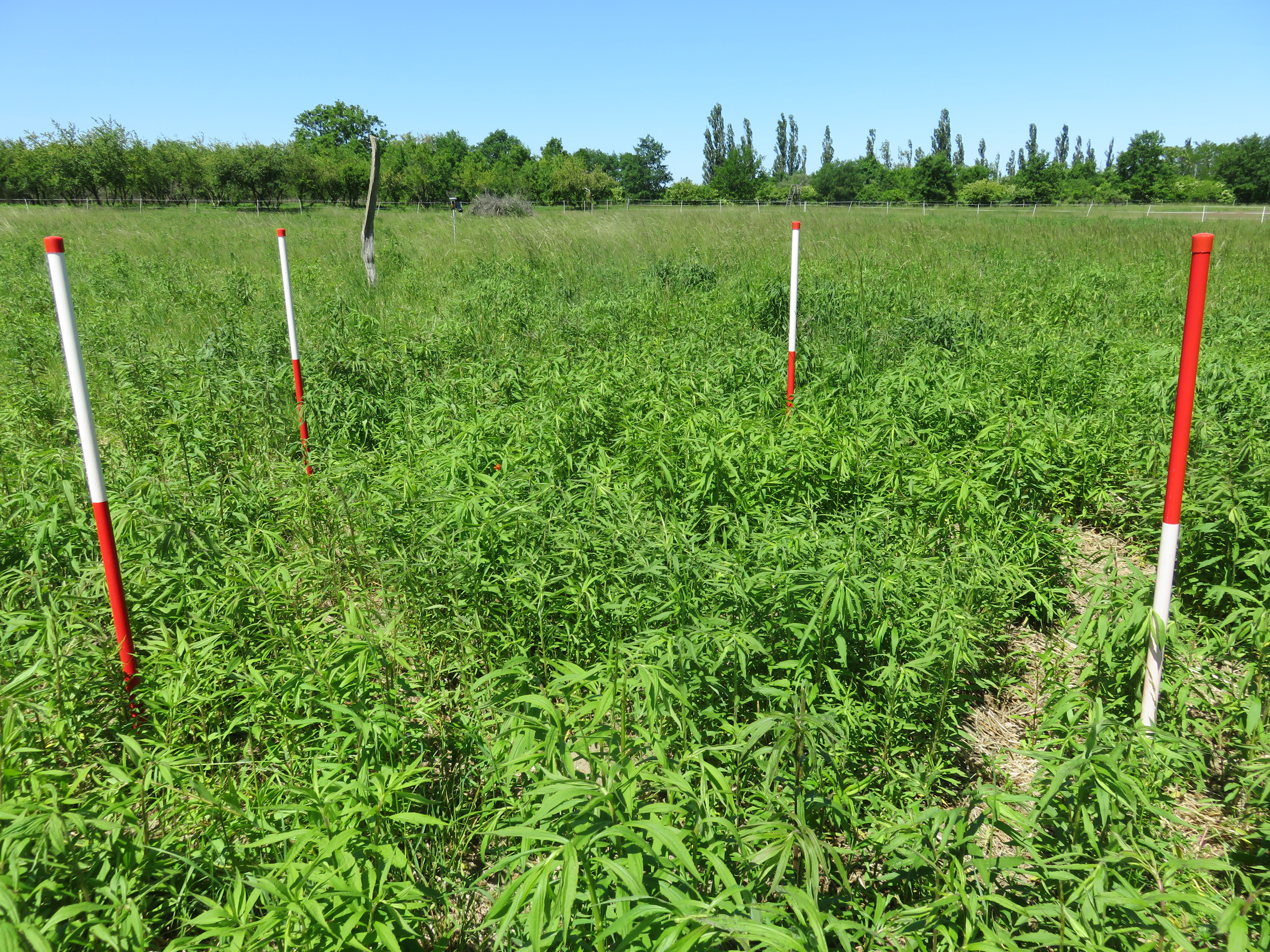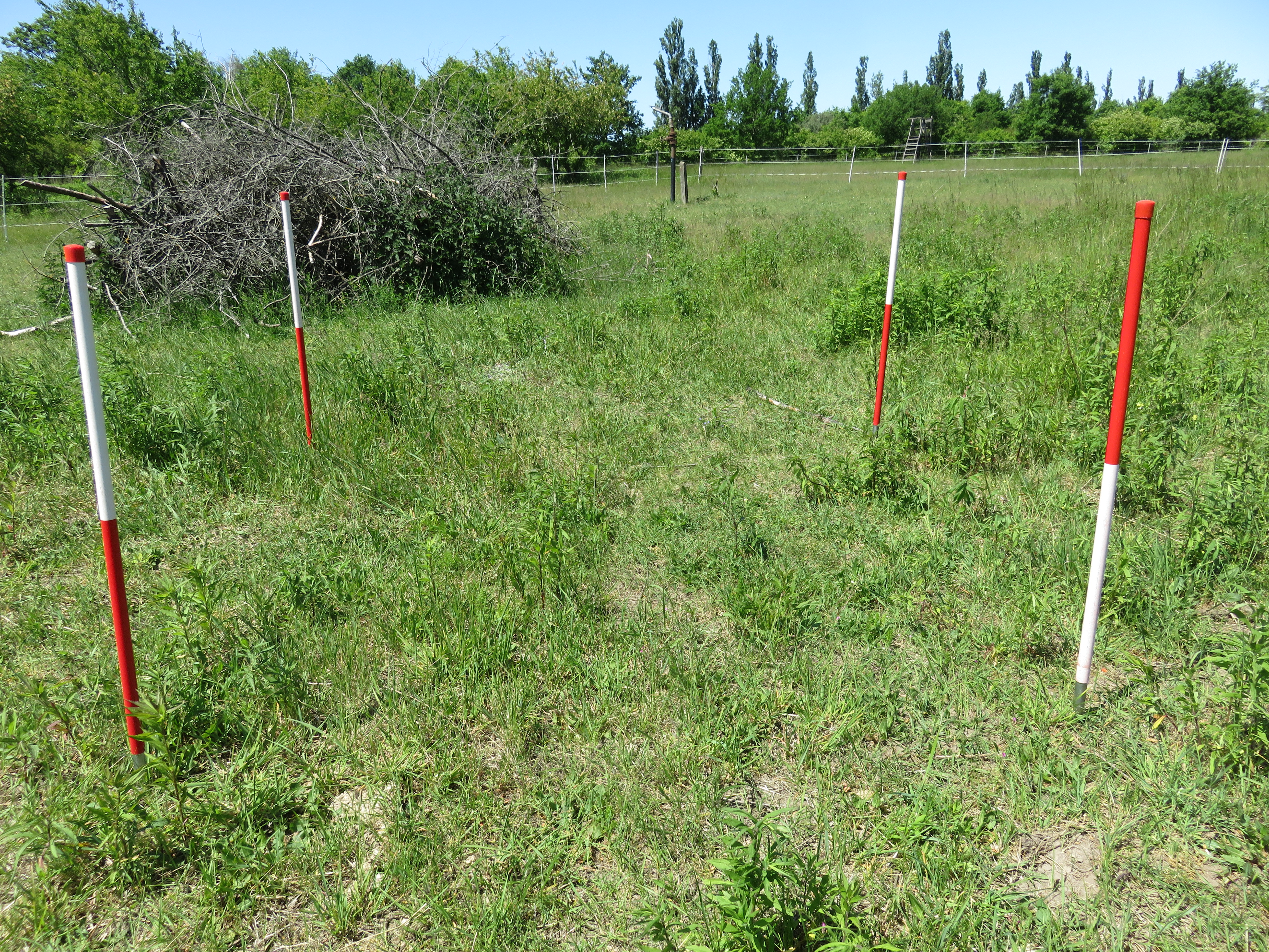 Aber wie sieht es nun mit dem Grünland in Glindow aus? Ich habe Pfingsten sinnvoll genutzt und ein Transekt mit elf Vegetationsaufnahmeflächen (2mx2m=4qm) angelegt. Hier soll die Entwicklung einer Fläche mit Dominanz aus Kanada-Goldrute unter dem Einfluss der Pflegemaßnahmen dokumentiert werden. Insgesamt wurden auf diesem Transekt immerhin 35 Pflanzenarten aufgenommen. Der Mittelwert liegt bei elf Arten pro Aufnahmepunkt.