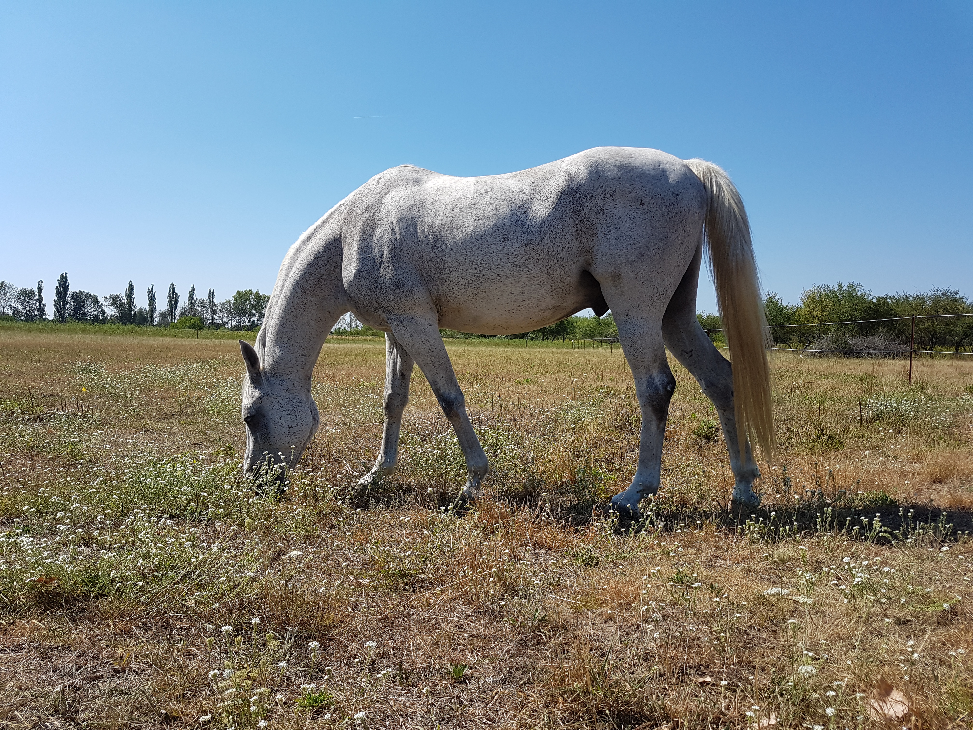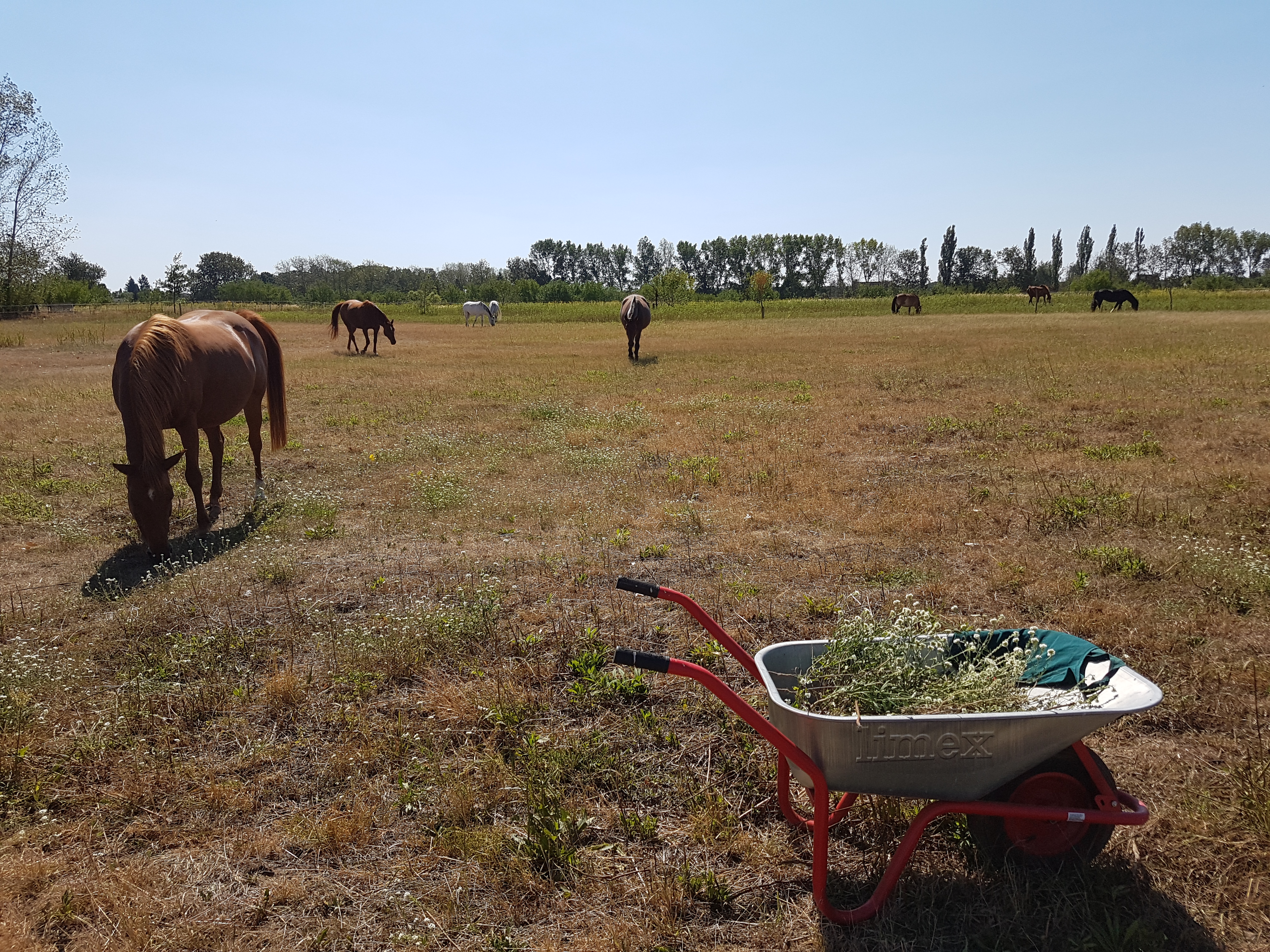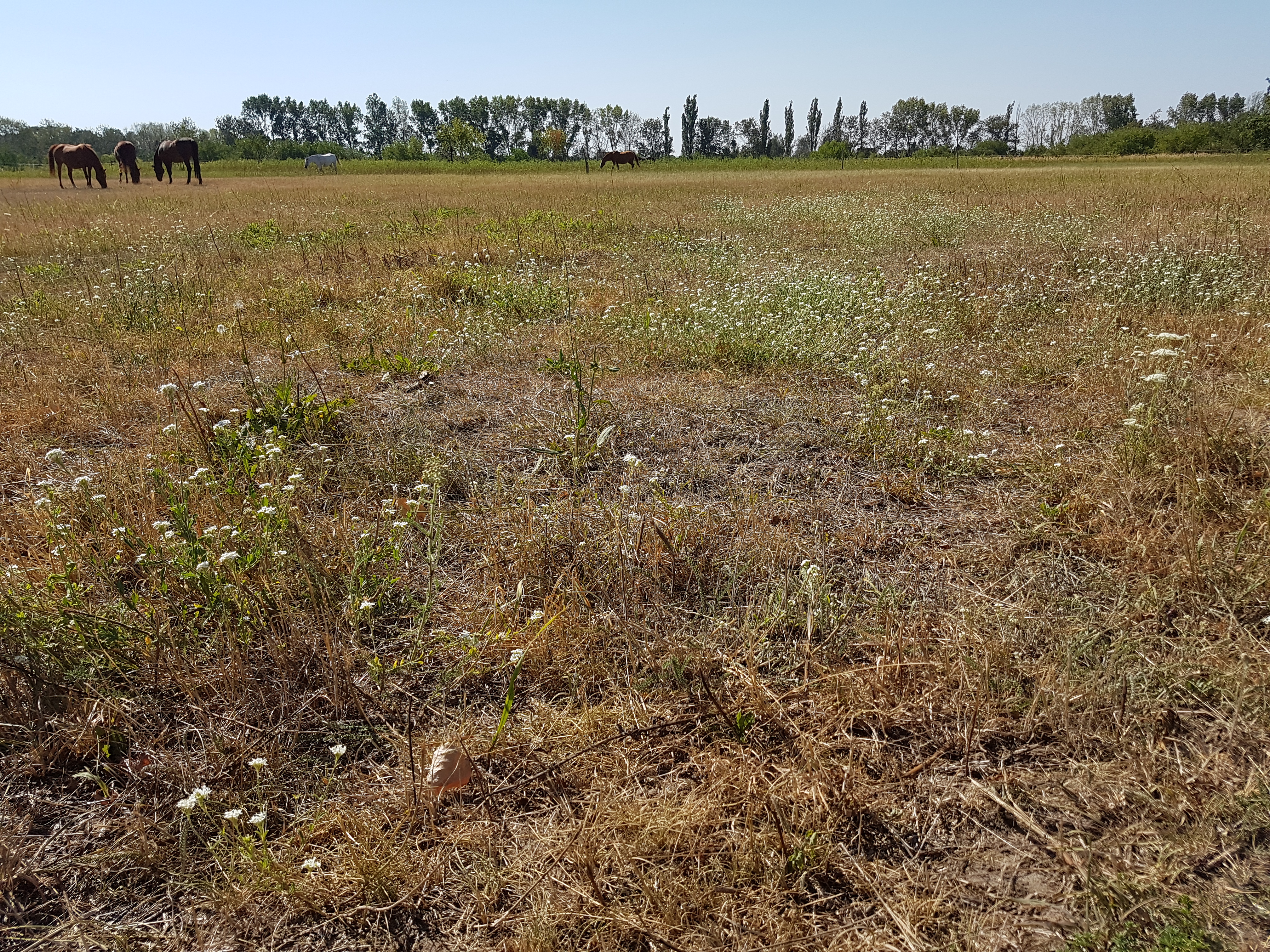 Ich hätte wirklich gern mehr Luzerne auf den Flächen in Glindow, aber stattdessen haben wir Graukresse – eine wahre Dürre-Queen! Nachdem die Mahd im Juni nicht geklappt hat und ich im Juli, als endlich der Mulcher repariert war, voller Optimismus gemulcht habe, ist nun alles verbrannt. Nur die Graukresse erhebt sich wie Phönix aus der Asche! Der Mulcher konnte ihr nichts anhaben, weil sie einfach zu niedrig am Boden wächst, nur umgeklappt wird bzw. erfasste Stengel einfach neu austreiben und sie am Ende noch buschiger wächst.