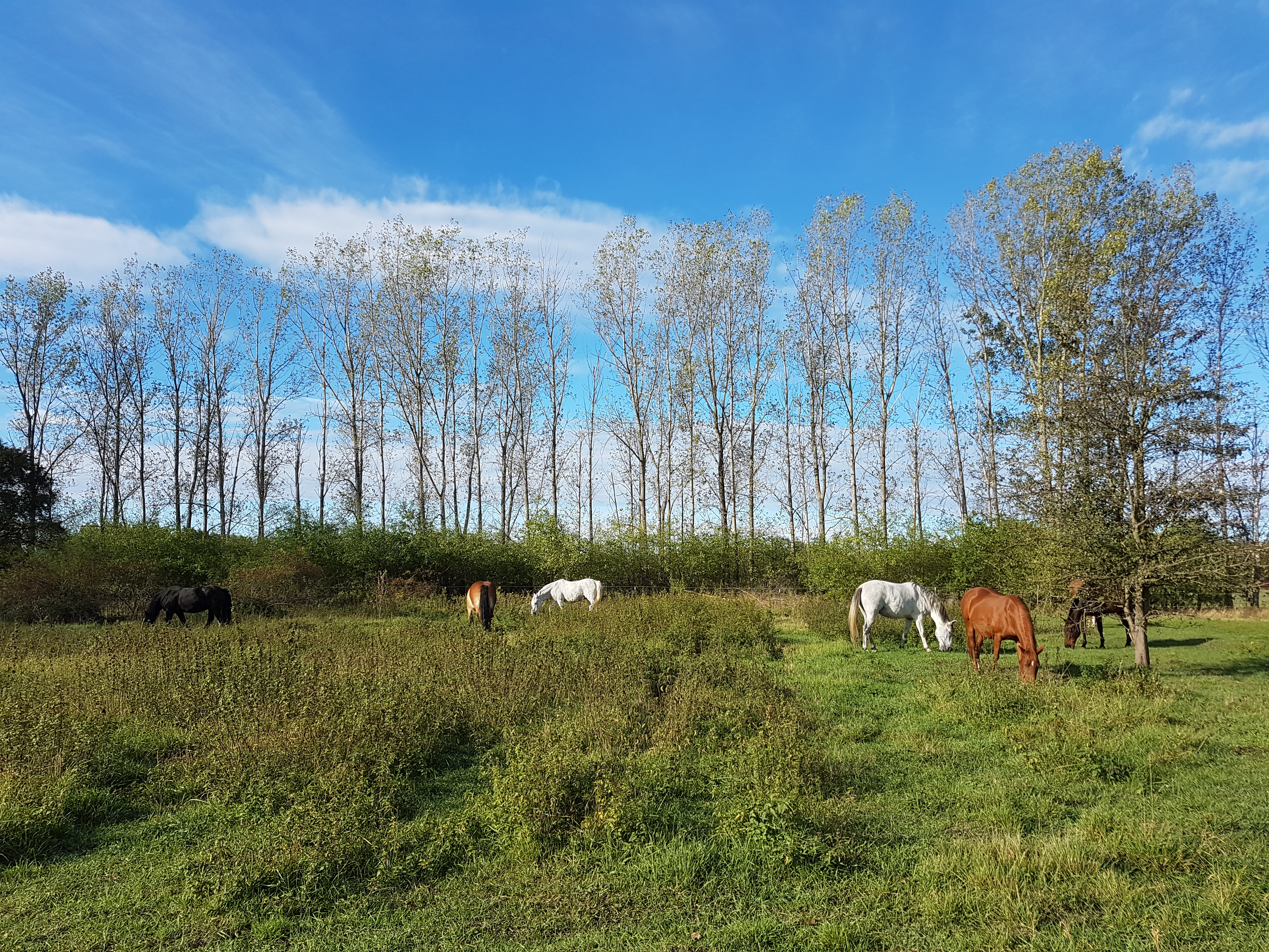 Es ist schön zu sehen, wieviel Auswahlmöglichkeiten die Pferde haben. Sie können Heu fressen, grasen gehen, an Gehölzen beispielsweise an Hagebutten naschen und zwischen drei Weiden wechseln. Ihr Tag ist nicht fremd bestimmt durch Boxen, Paddocks, Trails oder was immer. Sie können einfach da hin gehen, wohin sie möchten, natürlich in den Grenzen unserer Weideflächen…