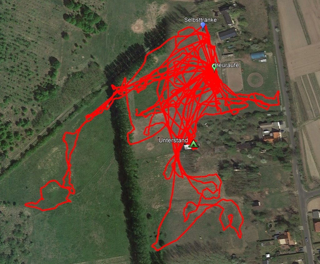 Zur Verfügung standen drei Weiden mit insgesamt 5,6 Hektar. Die Gesamtstrecke waren 9,6km, bei einer Durchschnittsgeschwindigkeit von fast 5km/h (Ruhezeiten sind rausgerechnet; sonst wären es 0,3km/h).