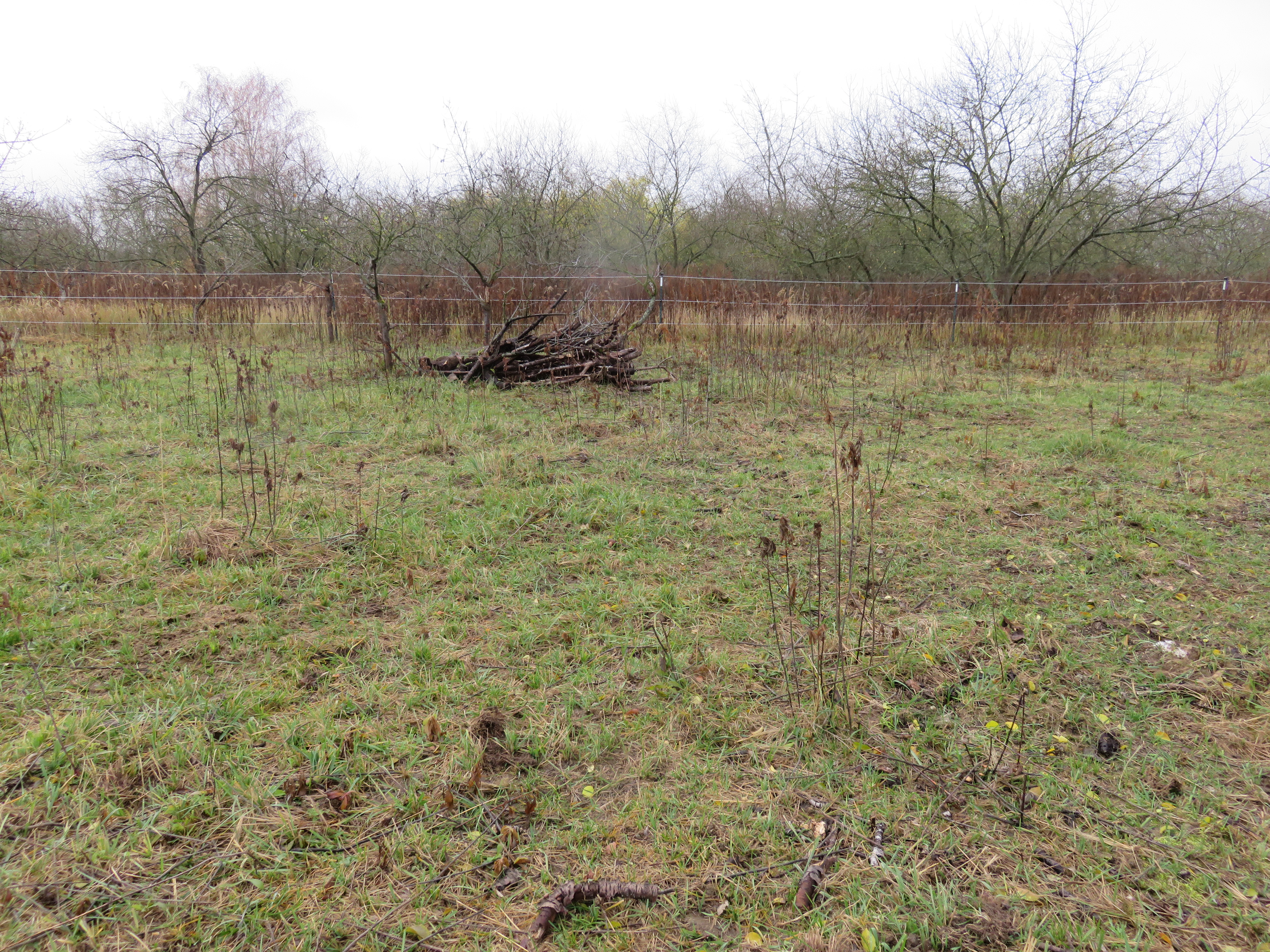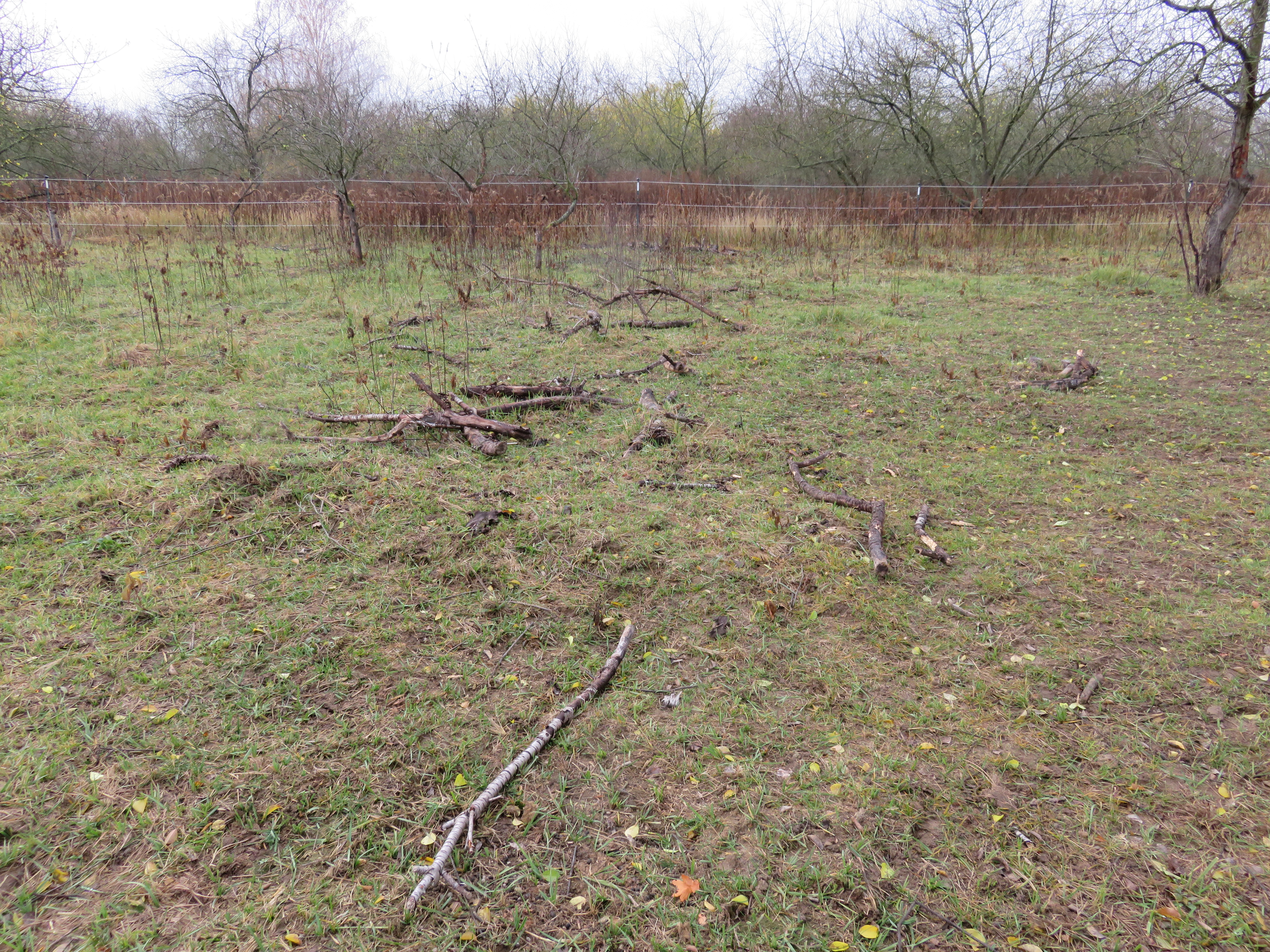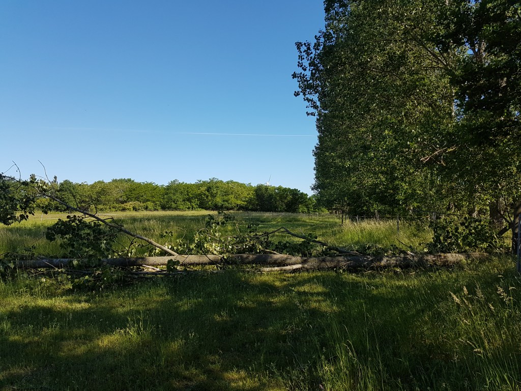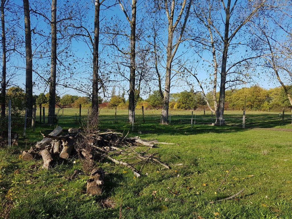 Auch die Vielzahl an Ästen, die zusammen kam, als wir Sträucher und alte Obstbäume entastet haben – vor allem zum Schutz der Pferdeaugen – wurden als Totholzhaufen liegen gelassen. Oder wenn mal die eine oder andere alte Pappel umfällt, bietet sie sicherlich auch Brennholz, aber nicht im Ganzen, es darf auch gern etwas liegen bleiben…