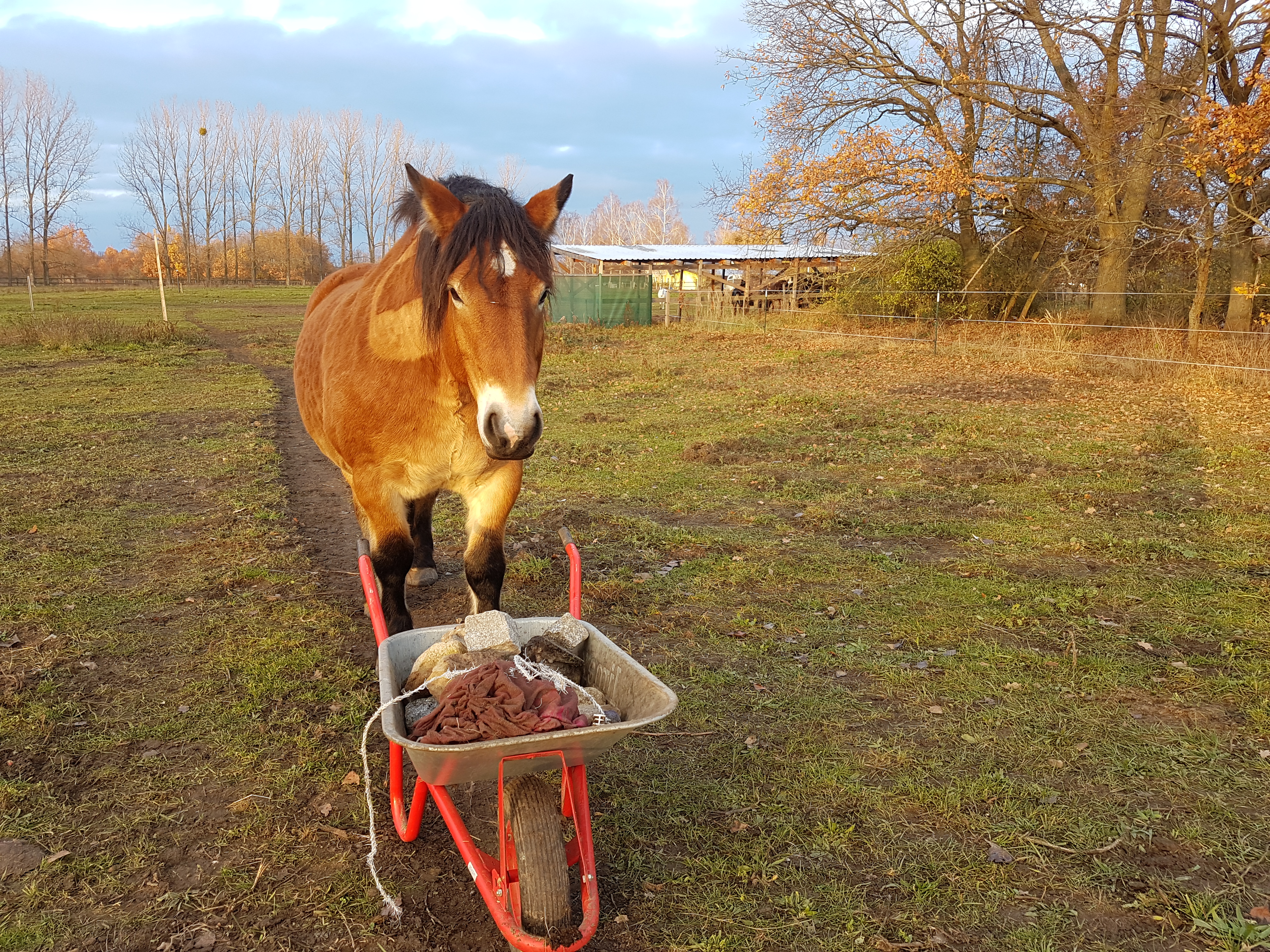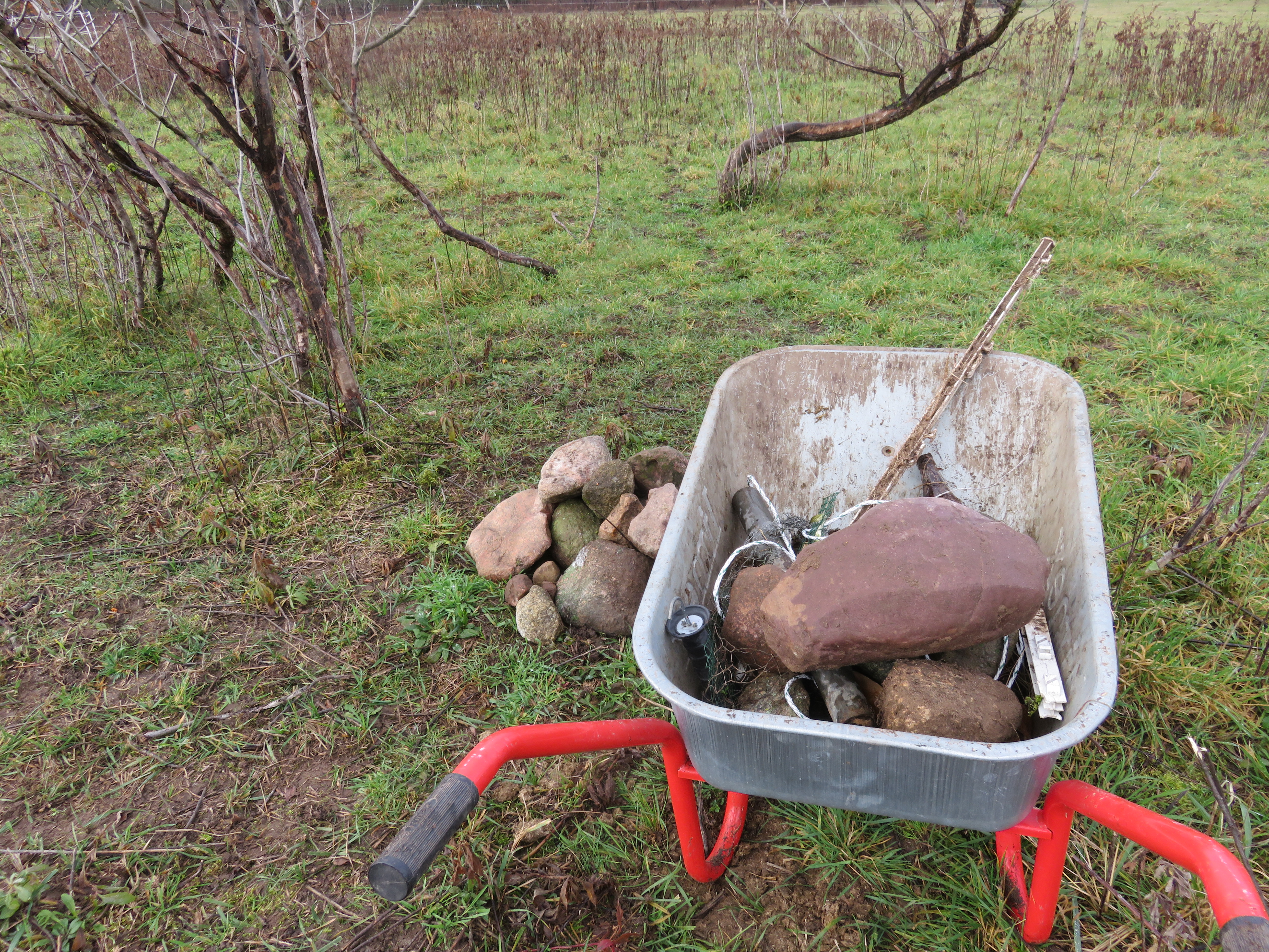 Aber als ich mich mit meiner Schubkarre aufgemacht habe, um Steine von unseren Flächen zu sammeln, habe ich auch gleich noch viel mehr gefunden, was durch die Bearbeitung zu Tage kam. Eine vielfältige Auswahl an Glas, Metall, Stoff und Plastik. Es ist also eine gute Gelegenheit mal die Koppel aufzuräumen 😉