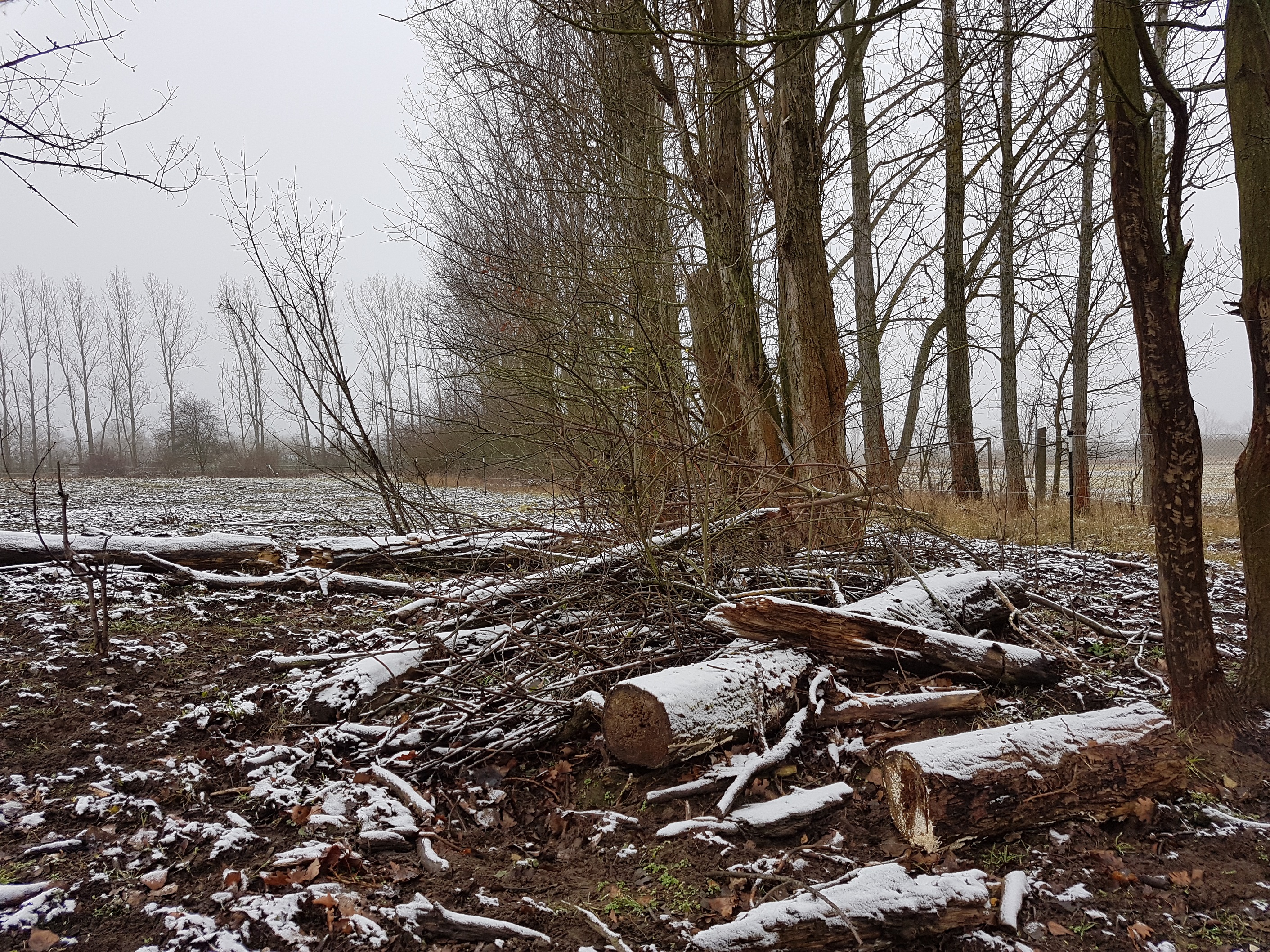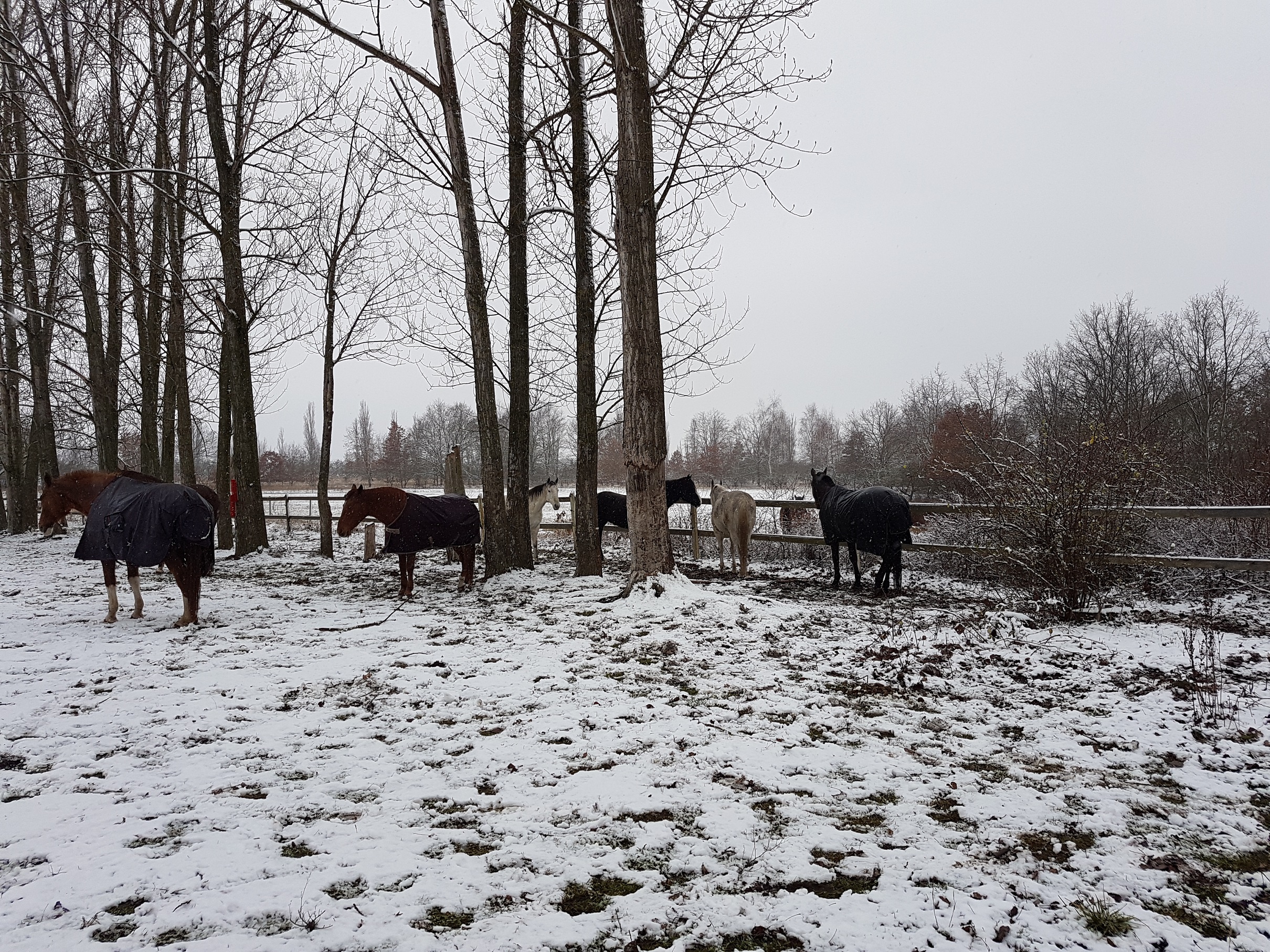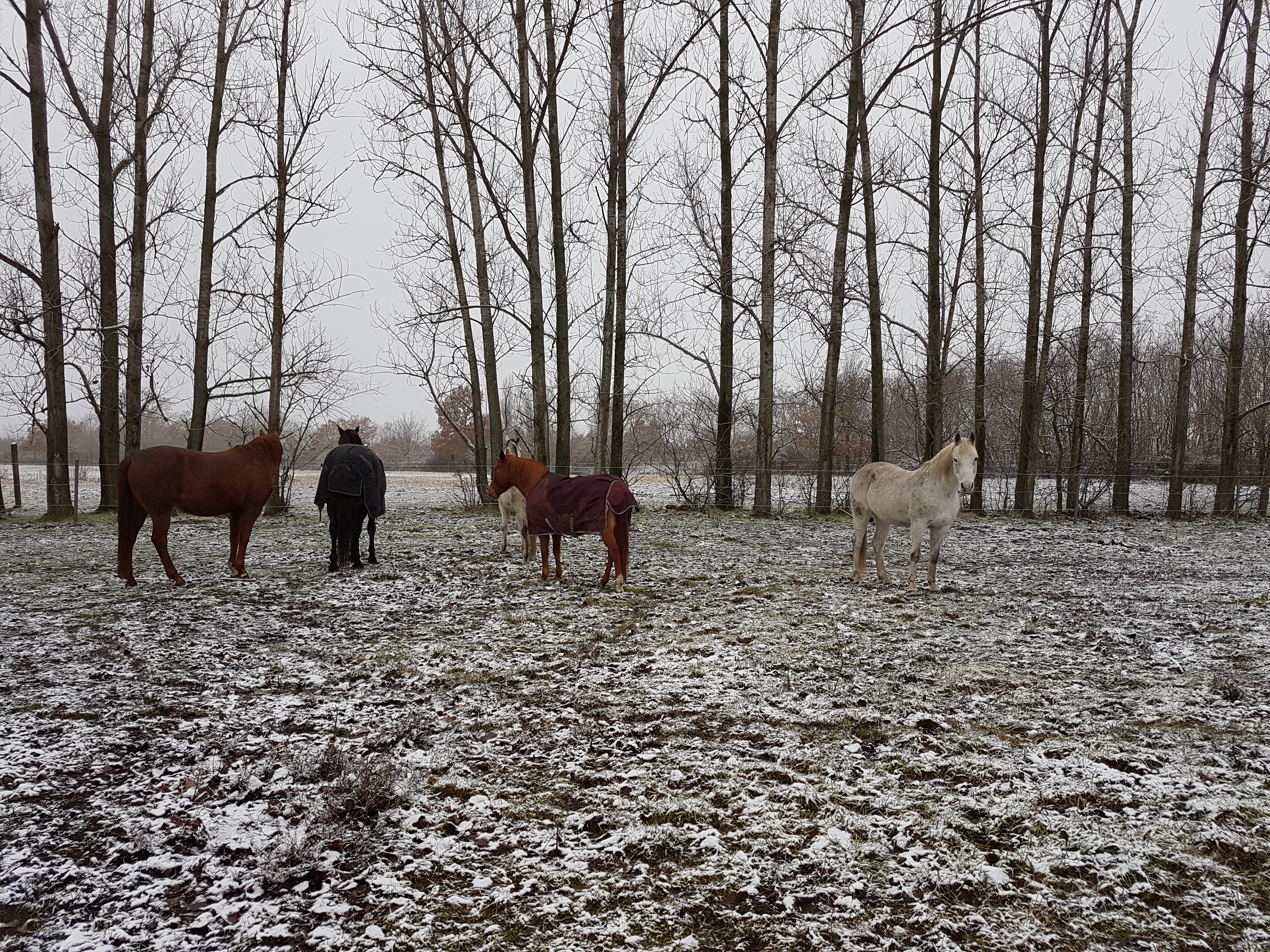 Es gab einen Trupp Saatkrähen, gemischt mit einigen Nebelkrähen, die durchzogen. Krähen, manchmal auch Dohlen und Kolkraben kommen immer wieder mal auf unseren Weiden gucken, ob es etwas in den Pferdehaufen zu holen gibt. Zwischen der großen Eiche hinter dem Unterstand und der Pappelreihe flogen immer wieder insgesamt drei Eichelhäher hin und her. Gern können sie noch weitere Eichen pflanzen ;-). Ansonsten konnte ich eine Kohlmeise und einen Jagdfasan hören, eine Amsel vorbei fliegen sehen, einen Grünspecht, einige Ringeltauben, Elstern und einen Trupp Erlenzeisige in den Pappeln beobachten.