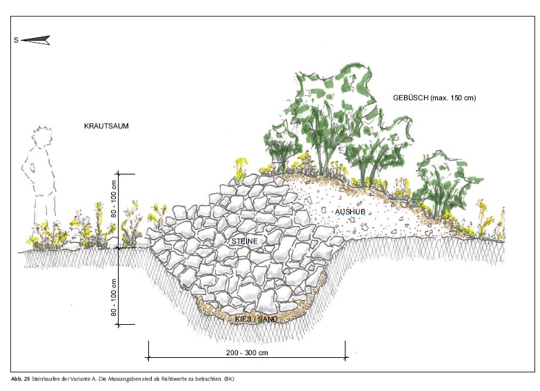 Man kann den Steinhaufen natürlich auch ohne Mulde anlegen, aber dann ist er nicht frostfrei bzw. als Winterquartier geeignet.