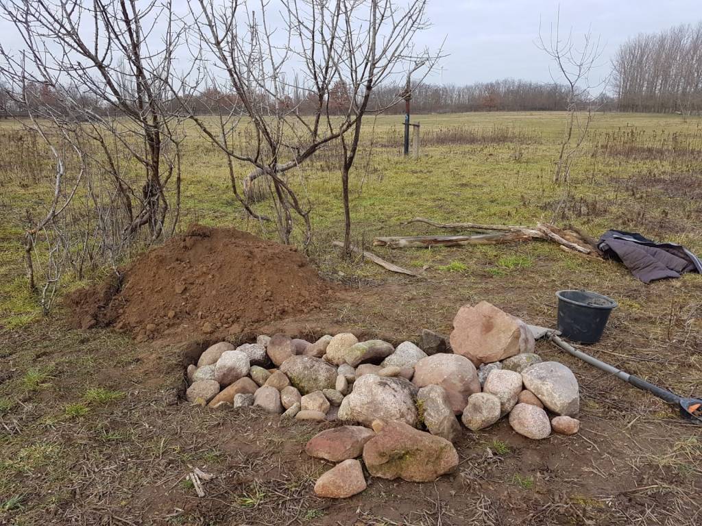 Ich habe ein Loch mit ca. 50cm Tiefe, 50cm Breite und 100cm Länge ausgehoben und zunächst eine Schicht aus kleinen Steinen, die ich vom Reitplatz gesammelt habe angelegt. Empfohlen wird eine Mulde mit 80-100cm Tiefe und eine Lage aus einer 10cm mächtigen Kies-Sand-Schicht als Drainage. Darauf kommen dann die größeren Steine mit möglichst vielen flachen Hohlräumen und zum Schluss der Aushub an die Rück- bzw. Nordseite.