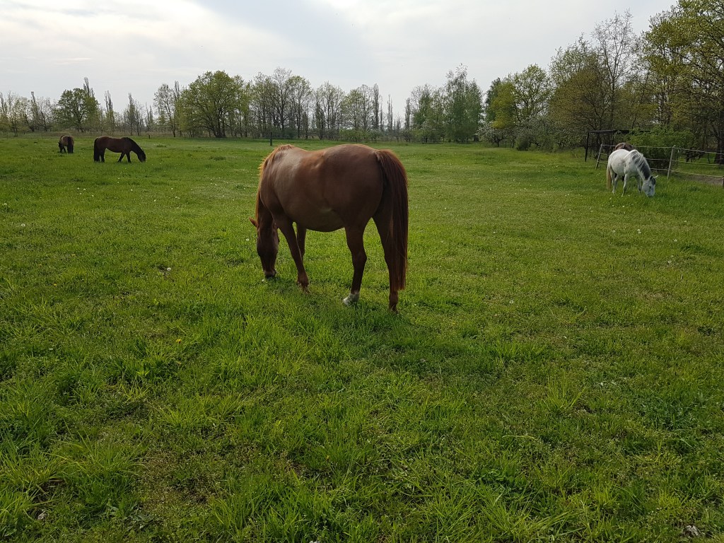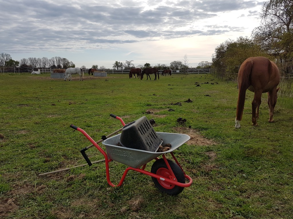 Damit die Dunghaufen nicht zur ökologischen Falle werden, haben wir die Pferde am Samstag auf einer kleinen Fläche „eingesperrt“, die Wurmkur gegeben und alles abgeäppelt. Gestern konnten die Pferde dann auf die „Dreieckswiese“, die seit dem letzten Sommer ungenutzt war. Ich möchte die Pferde so lange es geht von der – mit Würmern kontaminierten – Hauptweide fernhalten. Diese Fläche ist im Prinzip unsere Winterkoppel mit Unterstand, beheizbarer Tränke, die am meisten beansprucht wird und sie soll sich im Sommer etwas erholen können.