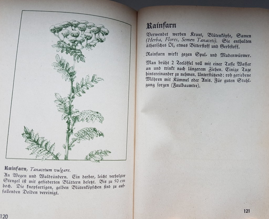 Die zwei Pferde, die nicht verwurmt waren, werden schon länger selektiv entwurmt und bekommen außerdem Ewalia Parasitensaft. Das zeigt, dass nicht zwangsläufig alle Pferde verwurmt sein müssen und das mit dem Kräutersaft werde ich auch ausprobieren. Bislang kannte ich nur die entwurmende Wirkung von Rainfarn (Tanacetum vulgare), den es auch auf unseren Flächen gibt und durchaus von den Pferden gefressen wird. Hier ein Auszug aus einem alten Kräuterbuch (für Menschen):