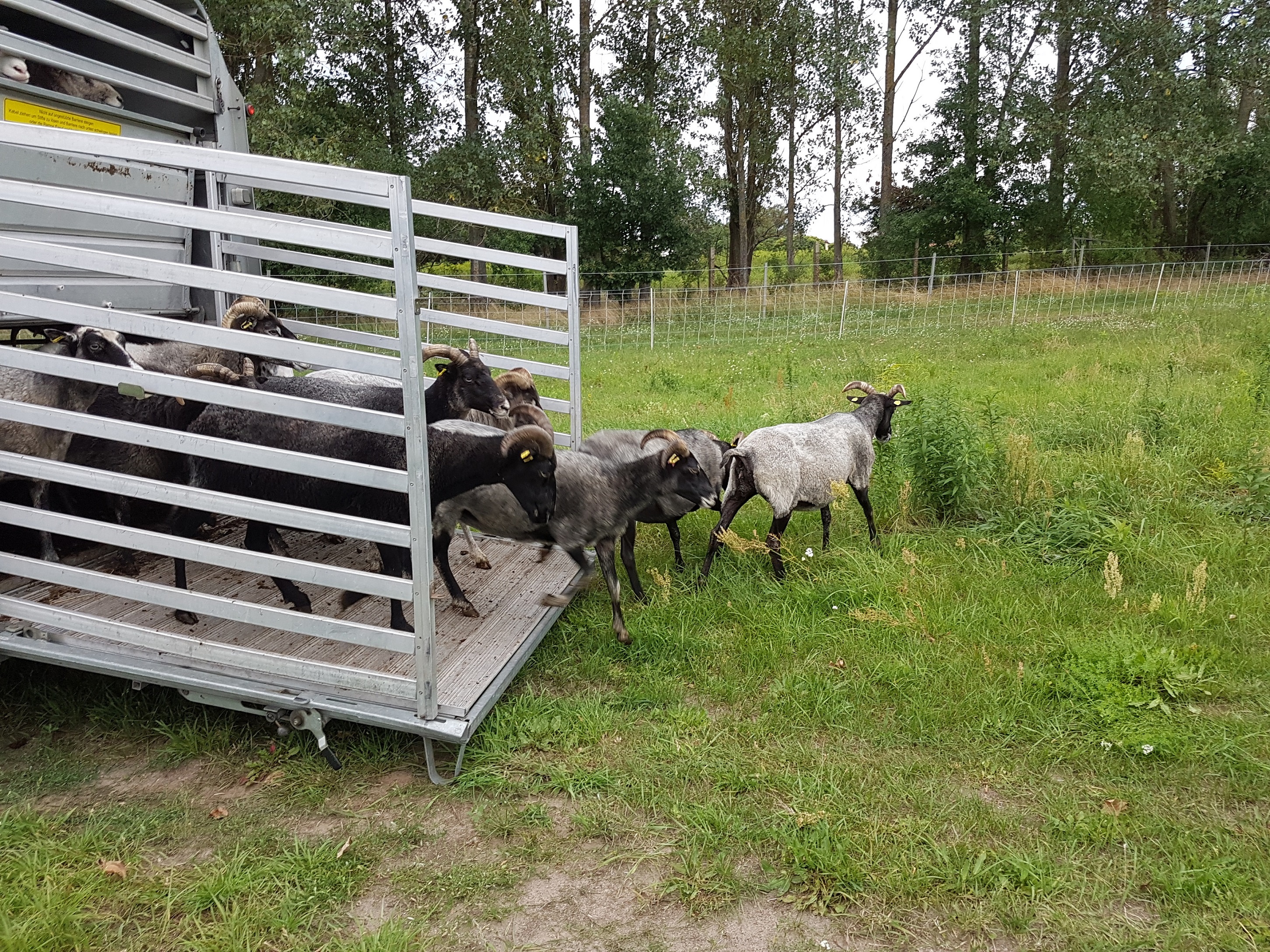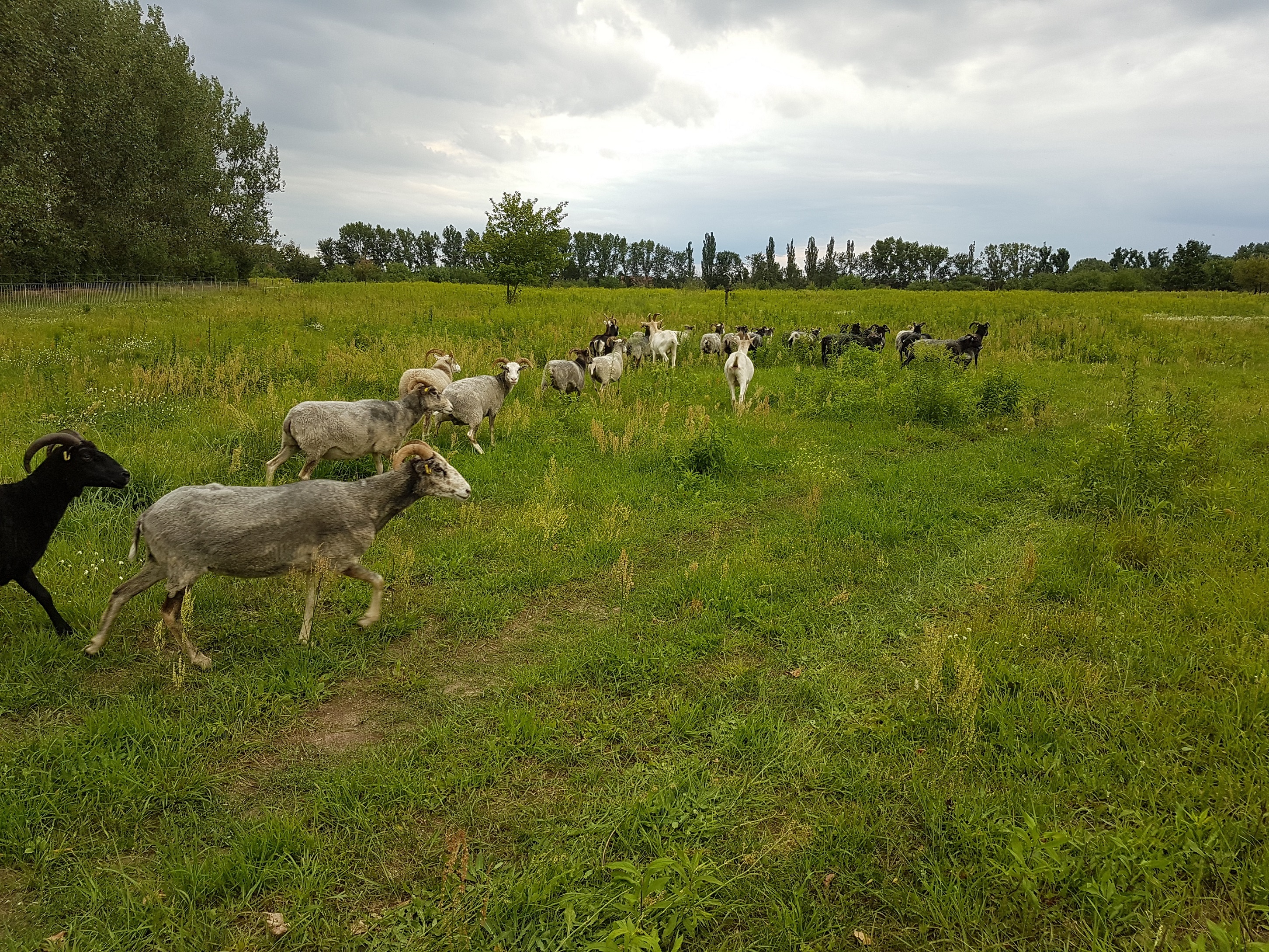 Wobei wir dieses Jahr (bisher) sehr viel Glück mit dem Wetter hatten, so dass die Vegetation nach jedem mulchen nachgewachsen ist und man immer wieder Flächen für die Pferde vorhalten konnte. Aber da ich noch einen „richtigen“ Job habe, kann ich nicht den ganzen Tag auf dem Traktor sitzen und so haben wir wieder Schafe im Einsatz: 43 Guteschafe und 5 Ziegen sollen zumindest eine Teilfläche mit Kanada-Goldrute abfressen.