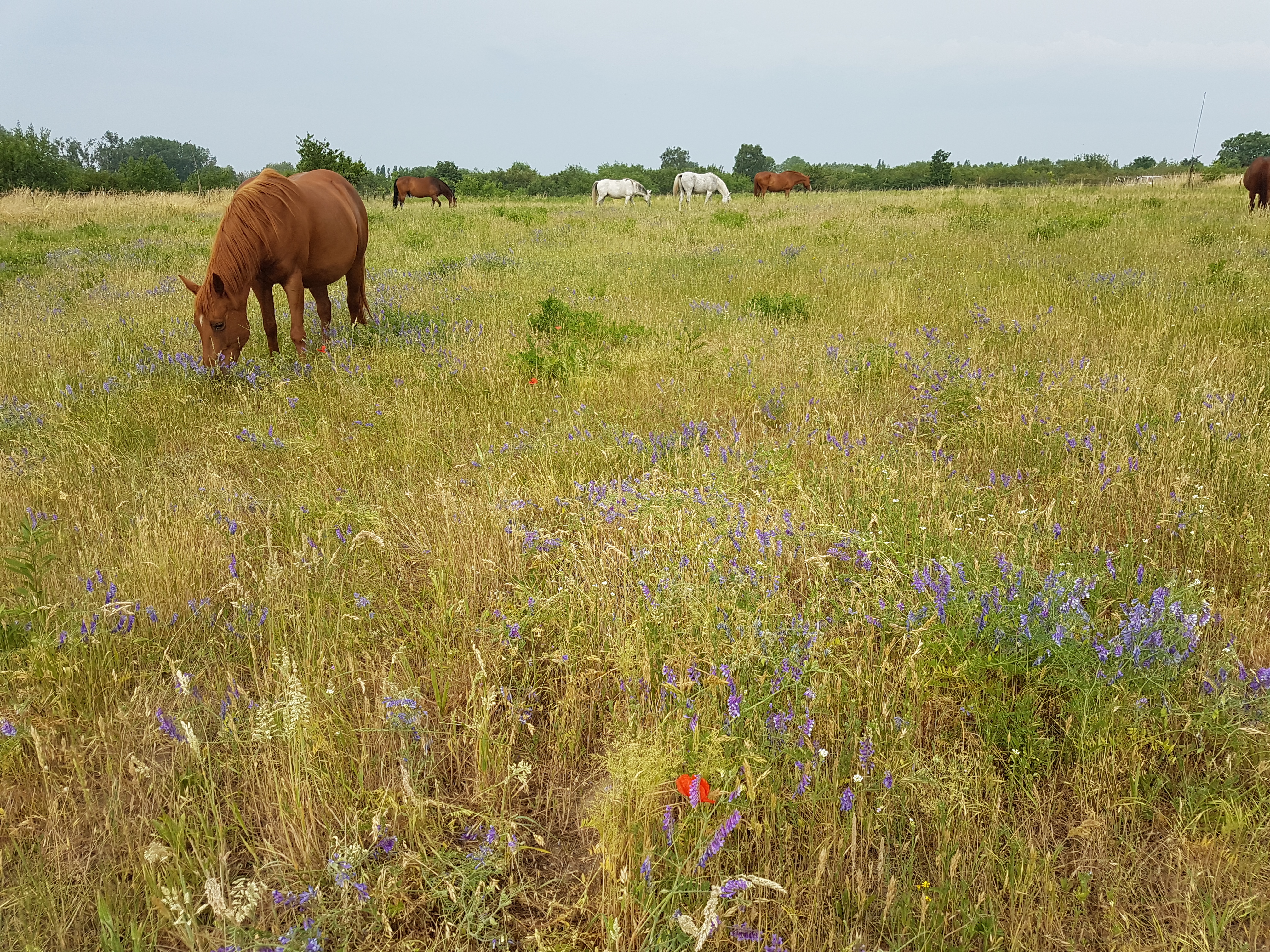 Die Idee der Verbindung einer – aus meiner Sicht – artgerechten Pferdehaltung mit den Zielen des Naturschutzes ist die Gewährleistung einer ganzjährigen Weidehaltung und dem Einhalten von Ruhezeiten für die Weide. Dabei muss gewährleistet sein, dass die Pferde genügend Futter finden, ohne die Leistung der Weide zu beeinträchtigen und möglichst noch Blühaspekte für Insekten zu schaffen. Das funktioniert bei unserer Anzahl der Pferde und der zur Verfügung stehenden Fläche nur als Umtriebsbeweidung.