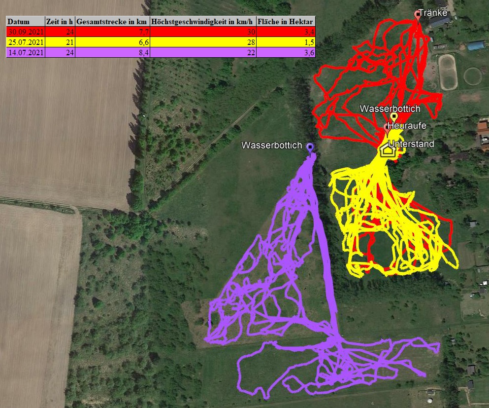 Bei Assan kann ich das nicht bestätigen. Seine individuelle Tagesstrecke sind ca. 8km, auch wenn es eine Heuraufe und einen Unterstand in der Nähe gibt. Natürlich nur, wenn er die Möglichkeit hat zusätzlich grasen zu gehen. Das folgende Luftbild zeigt drei GPS-Aufzeichnungen in diesem Jahr mit der Tagesstrecke und der zur Verfügung stehenden Weidefläche. Beim GPS-Tracking am 25.07.2021 (gelb) hat leider der Akku nicht ganz 24h durchgehalten. Dennoch sieht man, dass die Fläche erheblich kleiner war als am 14.07.2021 (lila) und Assan sich fast genauso viel bewegt hat. Im September (rot) wurde bereits Heu dazugefüttert und die Heuraufe stand direkt am Unterstand, nur die Tränke war weiter weg.
