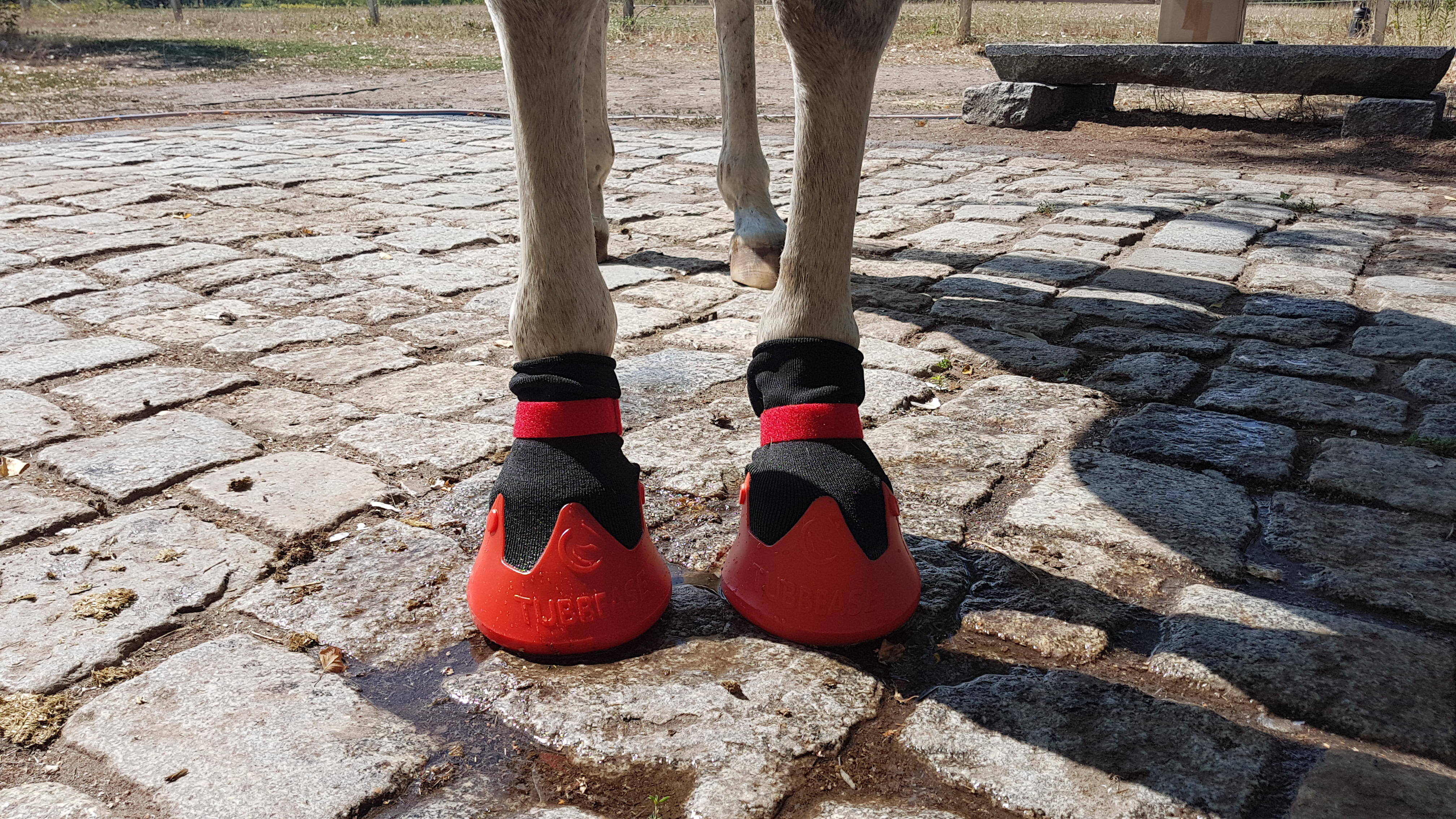 Nun hatte meine Hufbearbeiterin eine gute Idee: „Tubbease“ – Krankenschuhe, die eigentlich für einen Anguss-Verband gemacht sind und Flüssigkeiten wie Rivanol am Huf halten sollen. Nachdem Assan seine Ballerinas drei Tage jeweils eine halbe Stunde getragen hat, konnten gestern seine Hufe wieder ordentlich bearbeitet werden, ohne große Wasserverschwendung. Natürlich fand er die schwappenden, schmatzenden Hufsocken auch nicht besonders toll und hat mich fassungslos angestarrt, wie ich ihm das antun kann. Aber irgendwas ist immer und er musste damit ja nicht in die Herde gehen, sondern durfte mit seinen Schühchen auf dem Hof grasend rum-mäandrieren. So eine extra Wurst hat für ein Pferd den gleichen Stellenwert wie ein Mittagskind in der Kita zu sein 😉