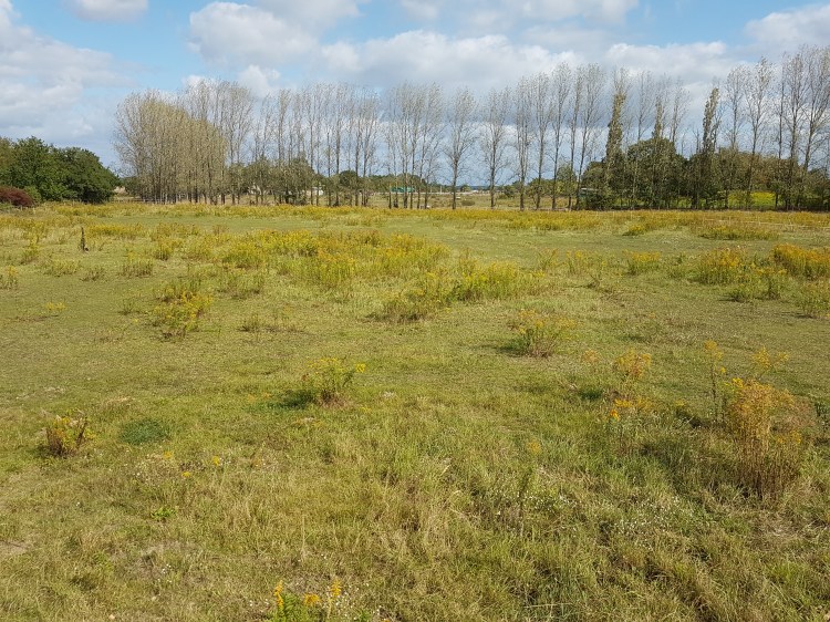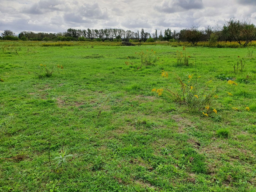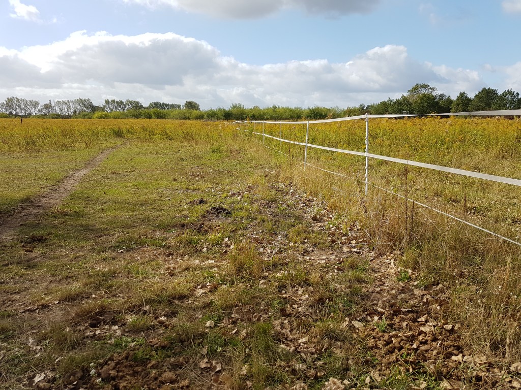 Folgender Blickwinkel zeigt die Grenze zwischen der Fuchswiese auf der linken Seite des Zauns und der Jägerwiese auf der rechten Seite. Man kann erkennen, dass die Kanada-Goldrute nicht mehr vollständig dominiert und die Bestände zumindest aufgelockert wurden. Hier war dieses Jahr die einzige „Pflege“ die Beweidung mit den Pferden und ein abschleppen der Heustellen. Weitere Maßnahmen wie Mulchen oder Beweidung mit anderen Weidetieren haben leider nicht geklappt, aber es wäre auch ohnehin nichts mehr nachgewachsen….