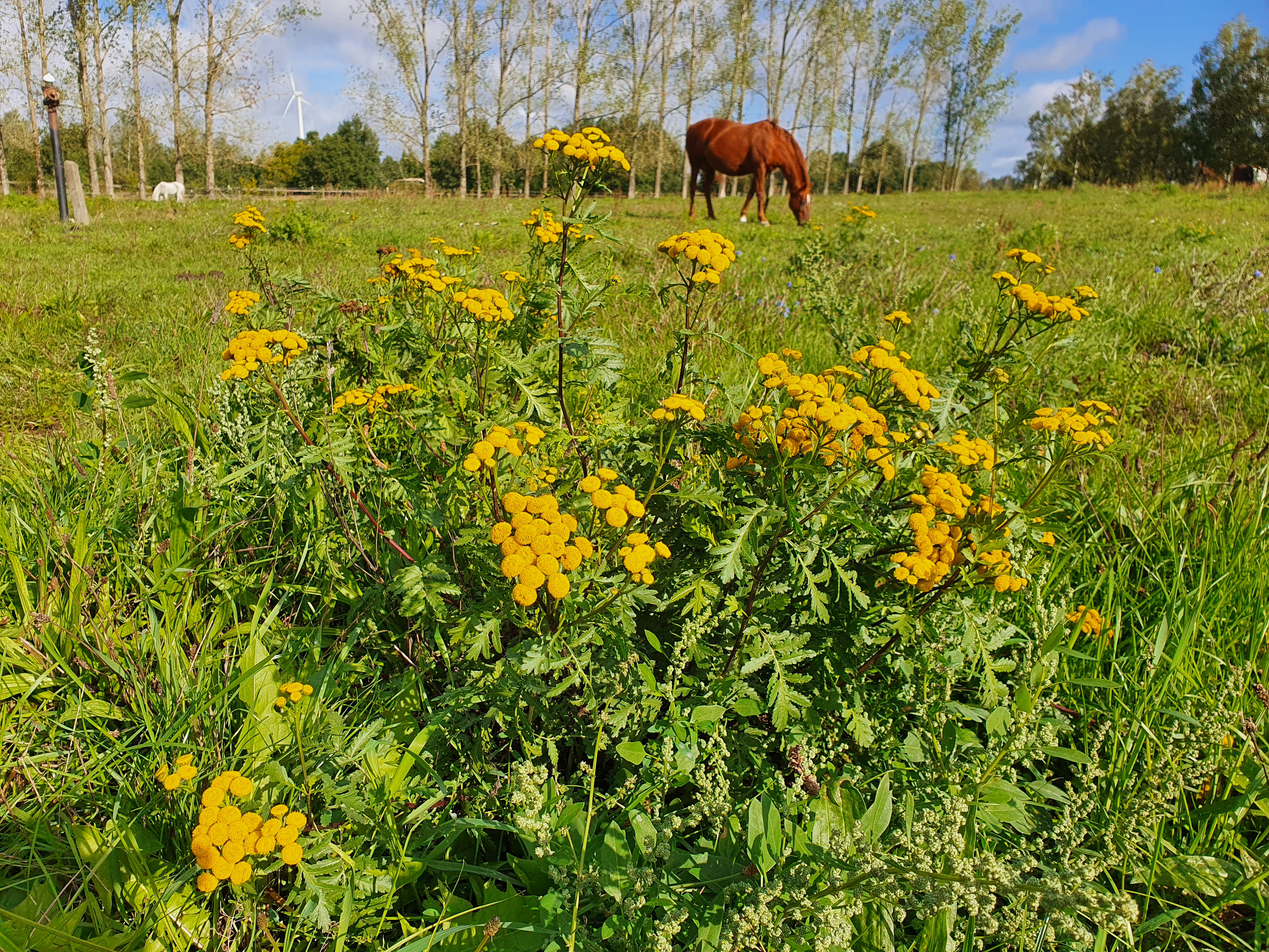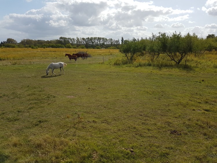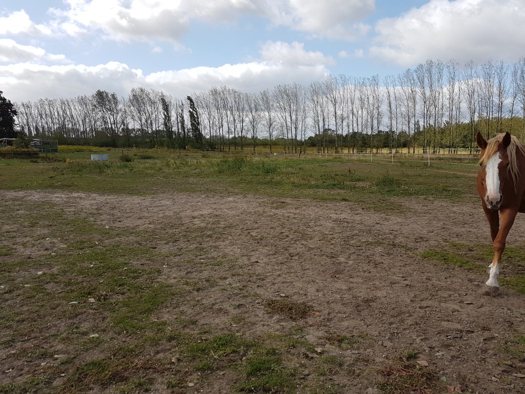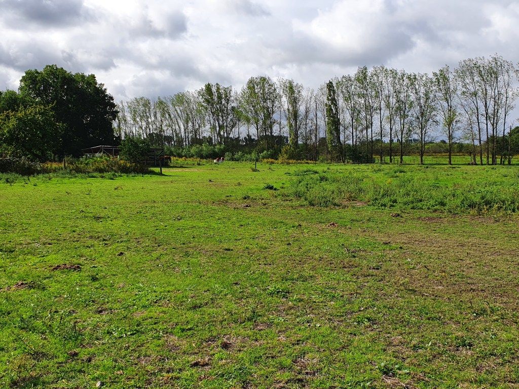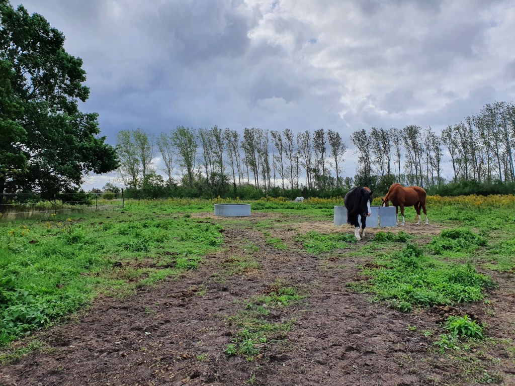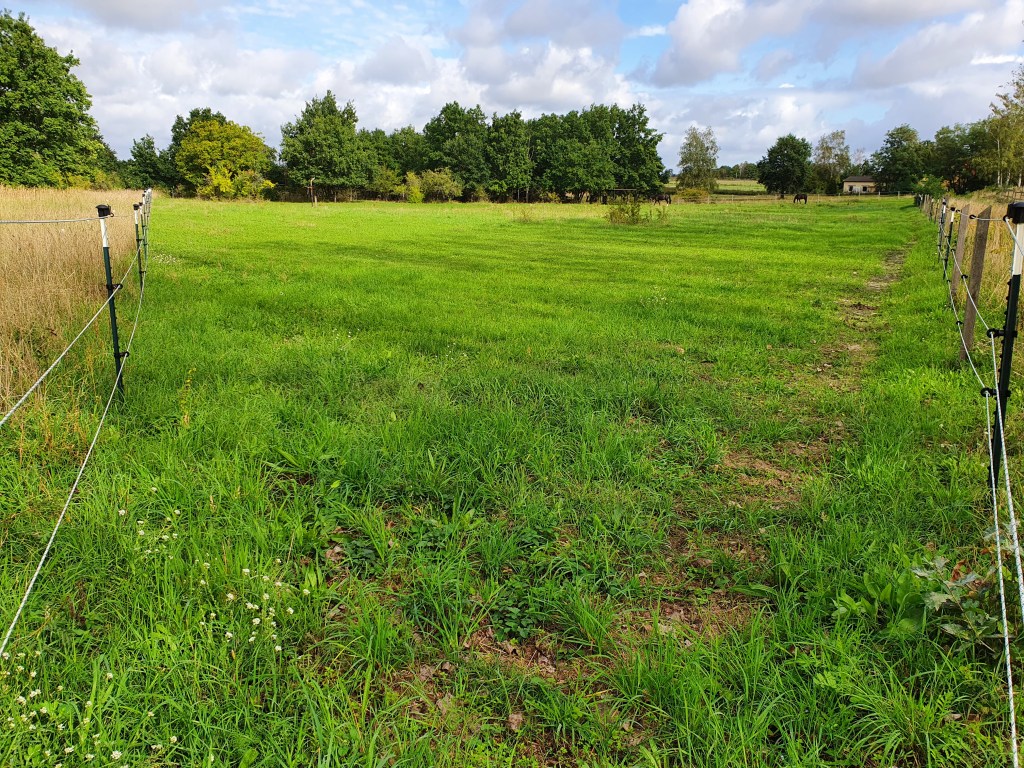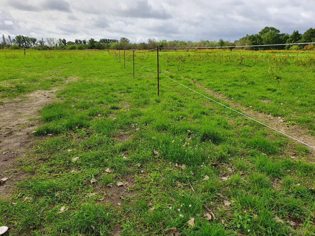 Und zu guter Letzt unsere Dreieckswiese, die als einzige Fläche keine „Problempflanzen“ aufweist. Damit das auch so bleibt, können die Pferde hier nur zweimal im Jahr für ca. eine Woche bleiben. Aber es gibt auch immer wieder Zwänge wie die Integration neuer Pferde oder aktuell die Seperation eines erblindeten Pferdes, die eine Nutzung dieser Fläche notwendig machen.