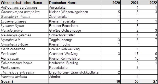 Folgende Tabelle listet die Arten mit ihrer jeweiligen Individuenanzahl bei etwa zehn Begehungen im Jahresverlauf zwischen April und Ende September auf.