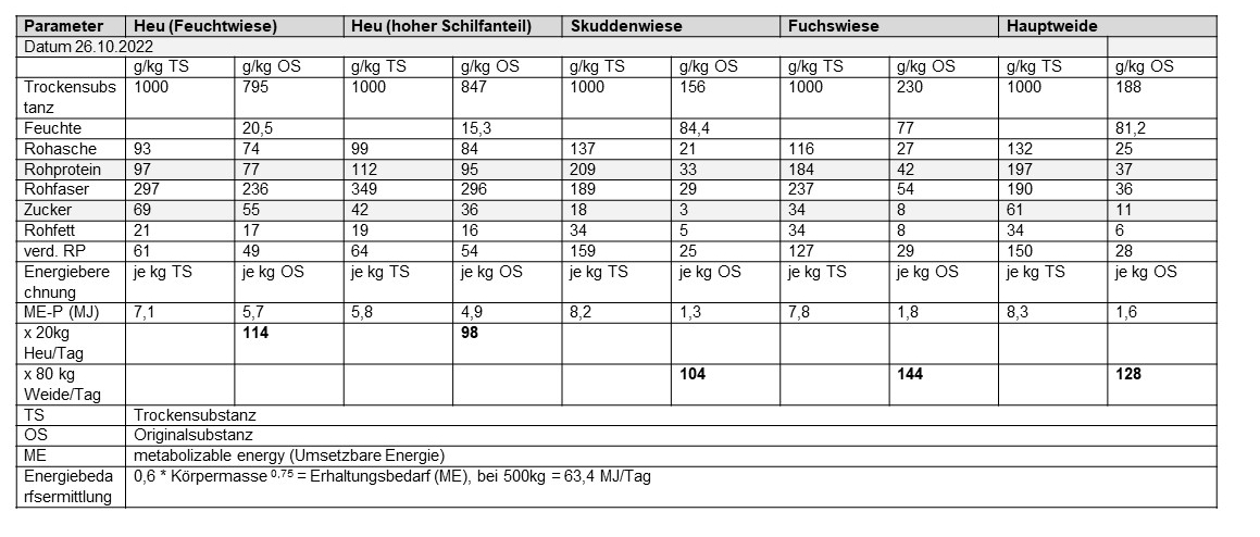 Wenn man sich zum Beispiel unser aktuelles Heu genauer angeschaut, ist das zwar von guter Qualität, riecht gut, ist schön grün, keine Anzeichen für Schimmel und die Pferde lieben es. Es ist ja auch relativ zucker- und proteinhaltig und für unsere „Fettis“ eigentlich zu gehaltvoll, dafür dass sie 24/7 Zugang zur Weide plus Heu ad libitum haben. Wenn man sich die Beispielrechnung in der Tabelle für ein Pferd mit 500kg und dem Erhaltungsbedarf anschaut, unter Berücksichtigung, dass unsere Freizeitpferde kaum „arbeiten“ müssen, ist es kein Wunder, dass wir pumelige Wohlstandspferde haben.