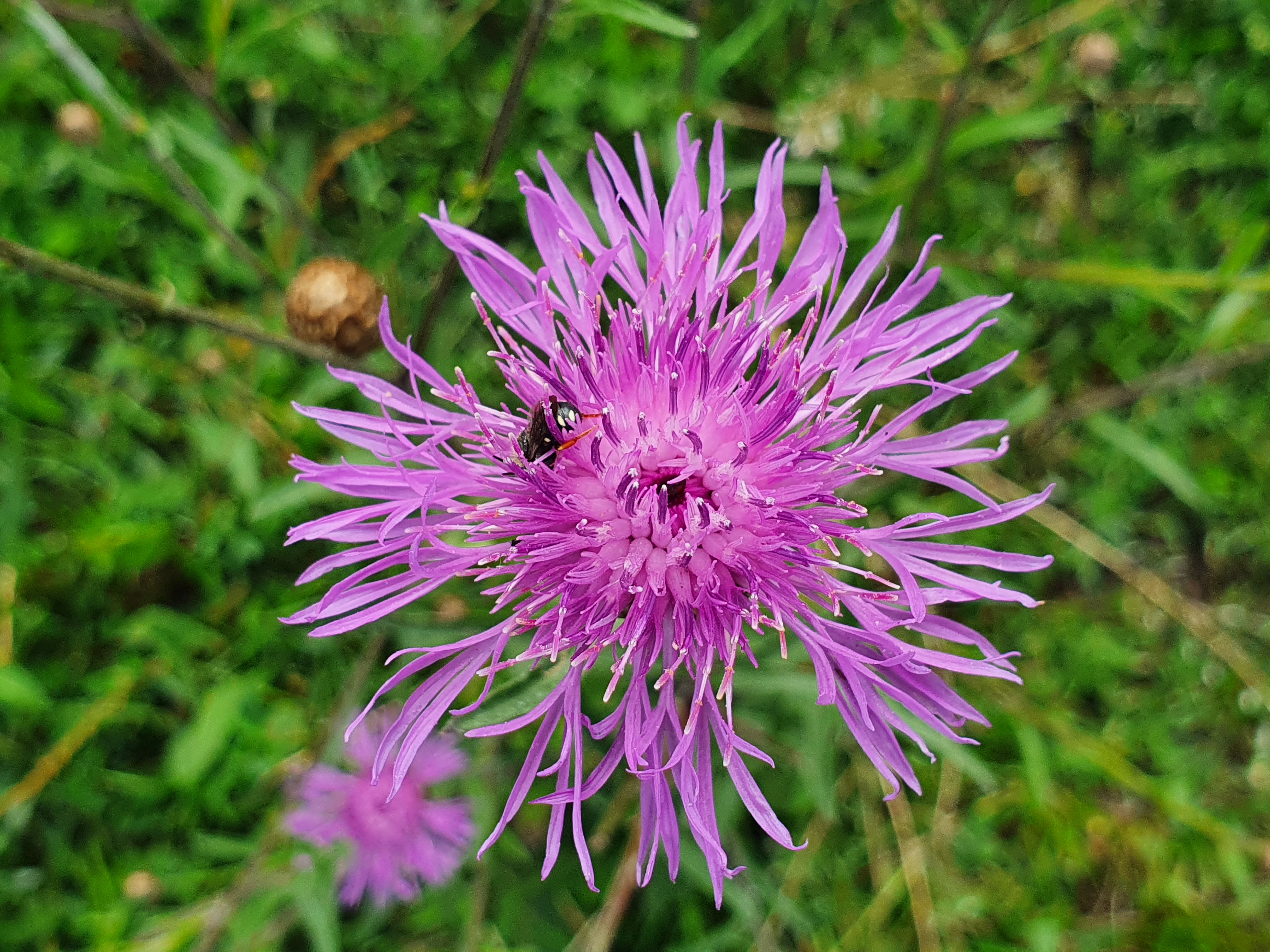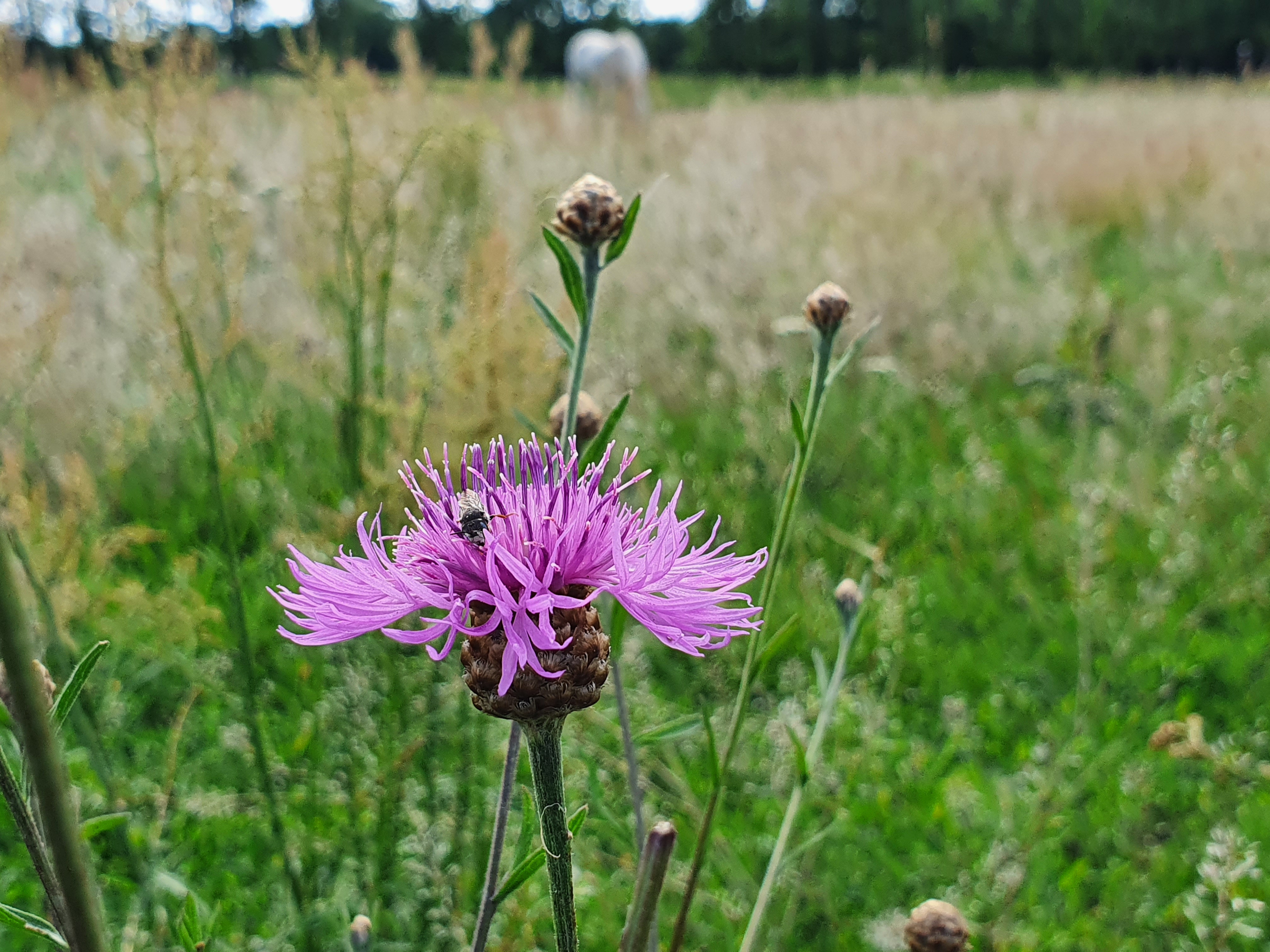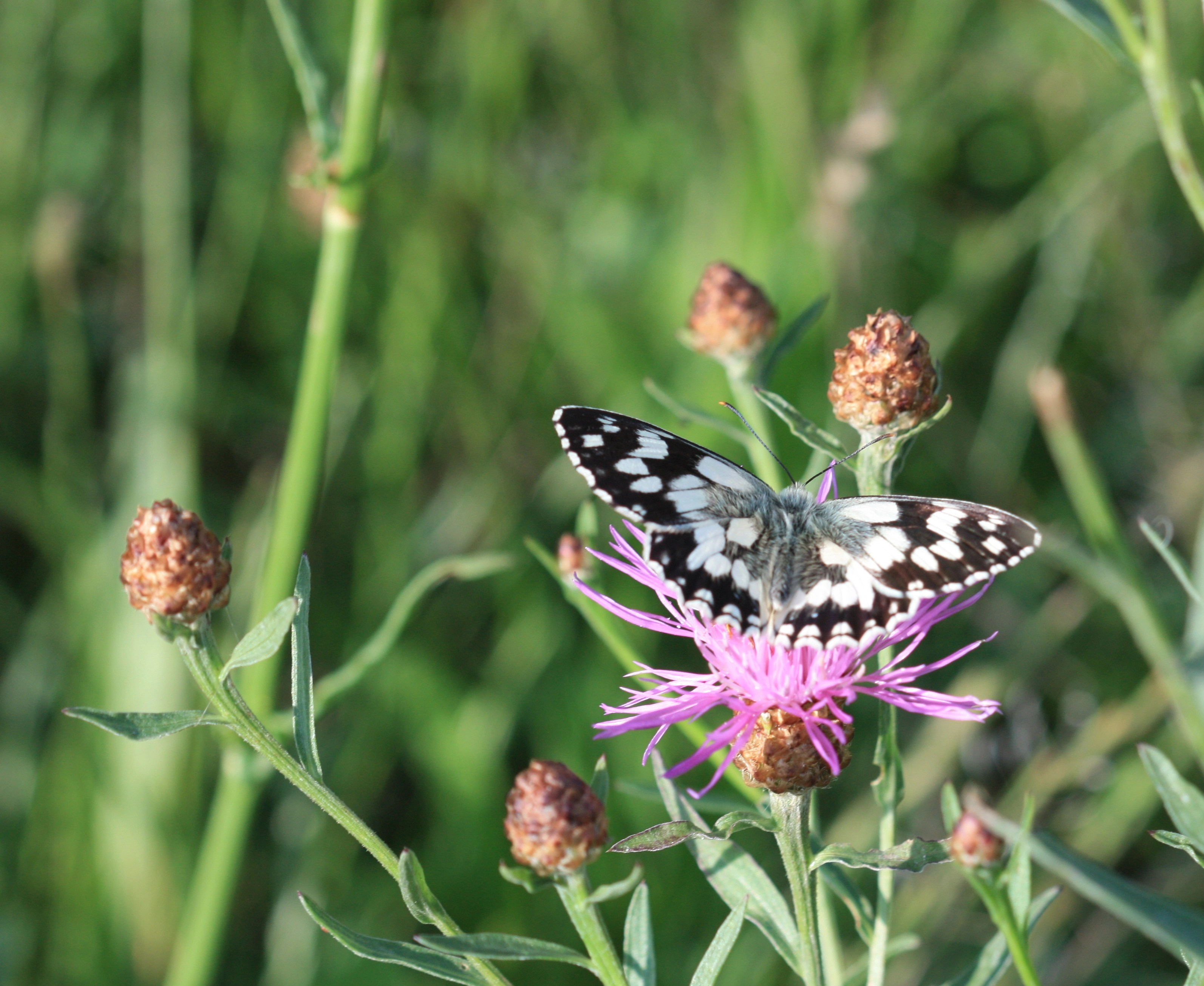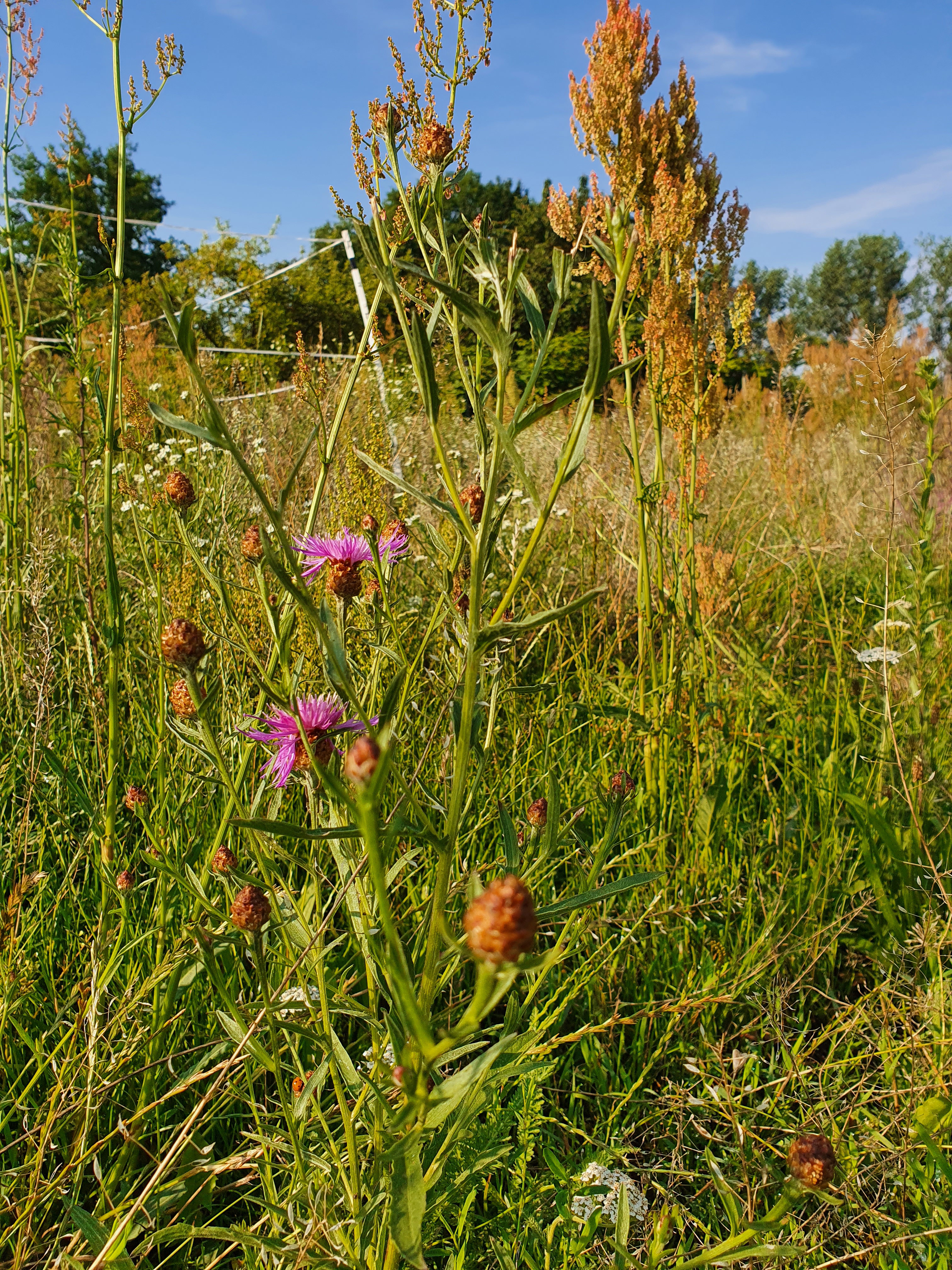 Wiesen-Flockenblumen haben einen besonders hohen Nekarwert für Wildbienen, Hummeln etc. und ernähren Raupen und Falter von über 40 Schmetterlingsarten. Sie kommen auf sandig bis lehmigen, trockenen bis mäßig feuchten Böden vor, blühen von Juni bis Oktober und wenn sie nicht zu stark verbissen werden, können sie sogar neue Triebe mit Blütenköpfen ausbilden und verlängern auf diese Weise das Tagfalter Bufett. Das heißt, Flockenblumen sind nicht besonders anspruchsvoll, vertragen moderaten Verbiss und sollten eigentlich auf jeder Weide vorkommen und dennoch gehört sie zu den in Brandenburg gefährdeten Arten. Was sagt das eigentlich über unsere Art der Flächennutzung aus? Oftmals ein Armutszeugnis…