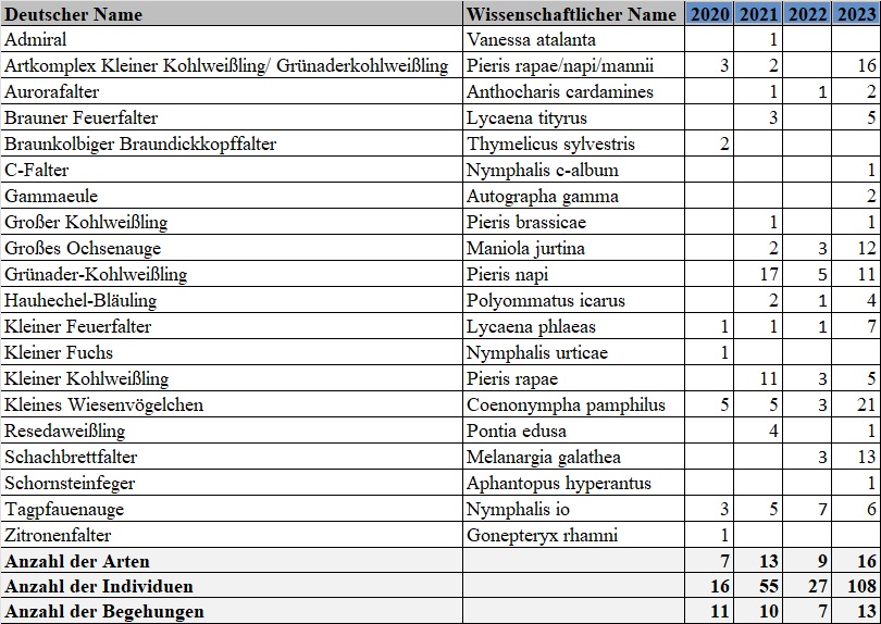 Mit der Einrichtung eines Vegetations– und Tagfalter-Transektes soll dieser Anspruch im Verlauf der Jahre überprüft und abgebildet werden. Und dieses Jahr habe ich auch mehr Zeit finden können, um mein Tagfalter-Transekt regelmäßiger zu begehen. Das spiegelt sich enstprechend in den Zahlen wieder: 16 Arten mit insgesamt 108 Individuen bei 13 Begehungen im Vergleich zum letzten Jahr mit nur sieben Begehungen: