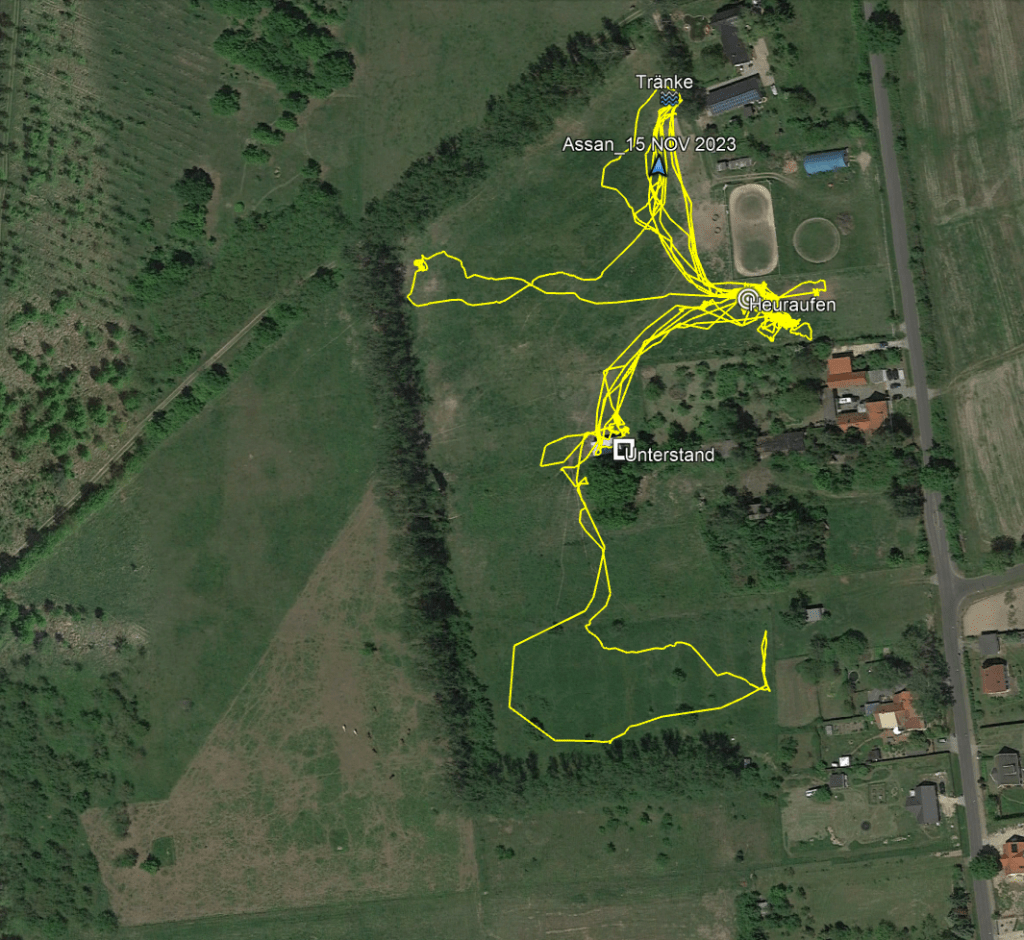 Natürlich ist dieser Vergleich nicht repräsentativ, wissenschaftlich oder statistisch auswertbar, dafür müsste man vielmehr solcher Tracking-Versuche an verschiedenen Pferden wiederholen. Aber der Vergleich der Laufwege deckt sich mit meiner Wahrnehmung, dass die Pferde sich im Winter kaum noch bewegen und (fast) nur noch an den Heuraufen stehen. Es würde auch absolut Sinn ergeben, Energie zu sparen und sich nicht mehr zu bewegen als nötig, wenn unsere Wohlstandsponys nicht tendenziell zu dick wären…