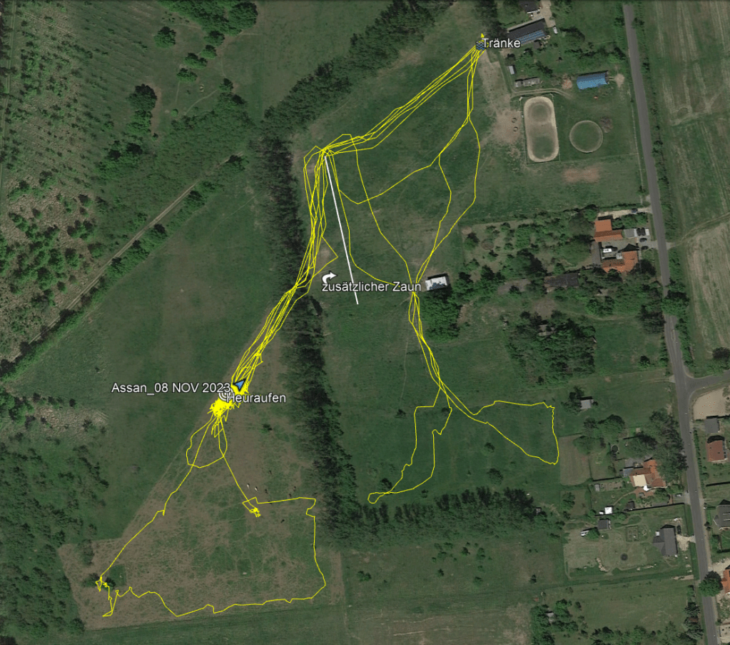 Nun hat sich die Frage ergeben, ob man die Laufwege auch im Winter mit Heufütterung verlängern kann. Dafür haben wir die Heuraufen auf eine der Weiden gestellt und noch einen zusätzlichen Zaun gezogen, um den die Pferde drumherum mussten. Auf diese Weise wurde der Weg zwischen den Heuraufen und der Tränke von 100m auf 300m verlängert. Für den Vergleich mit und ohne „künstliche“ Laufwegeverlängerung wurde wieder ein GPS-Tracking Zeitfenster von 24h gewählt (jeweils von 18:00-18:00 Uhr) und ansonsten die gleichen Weiden offen gelassen.
