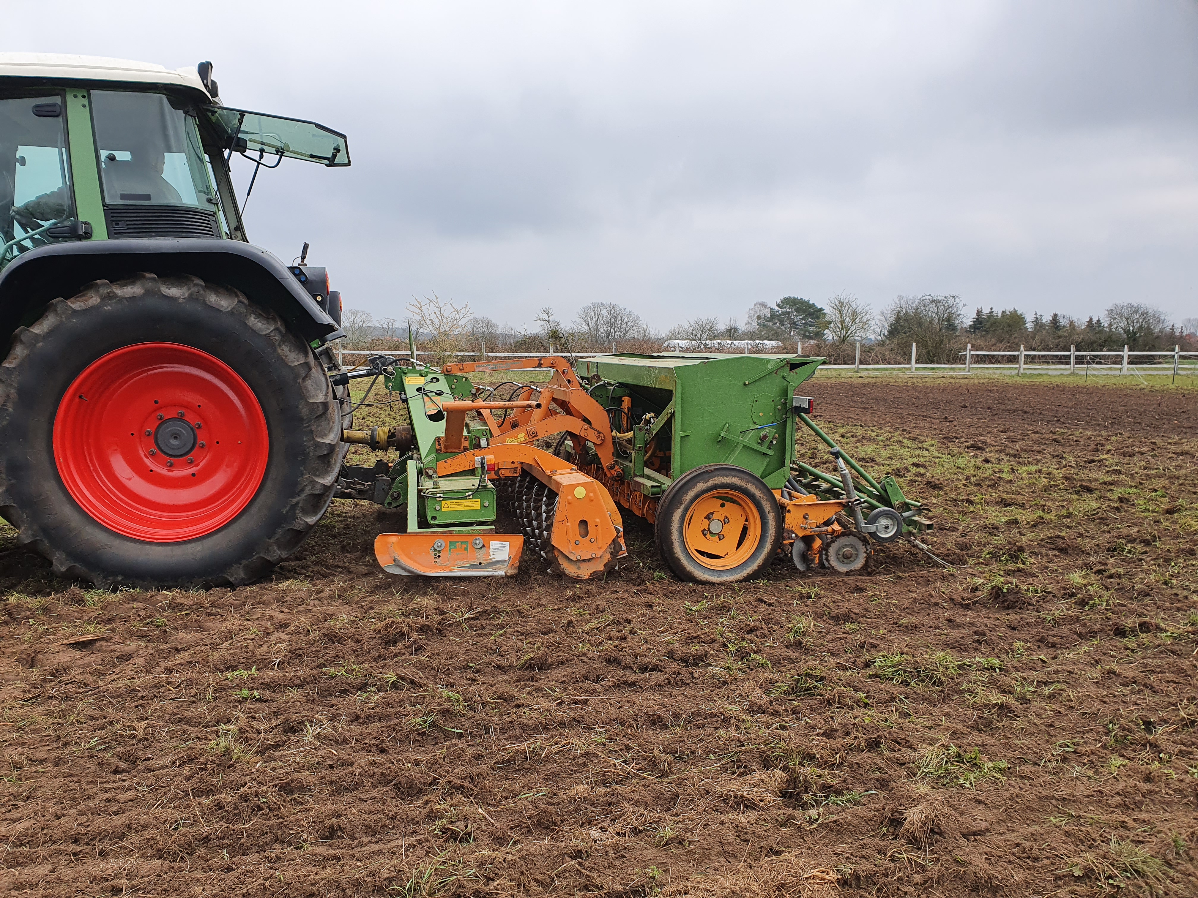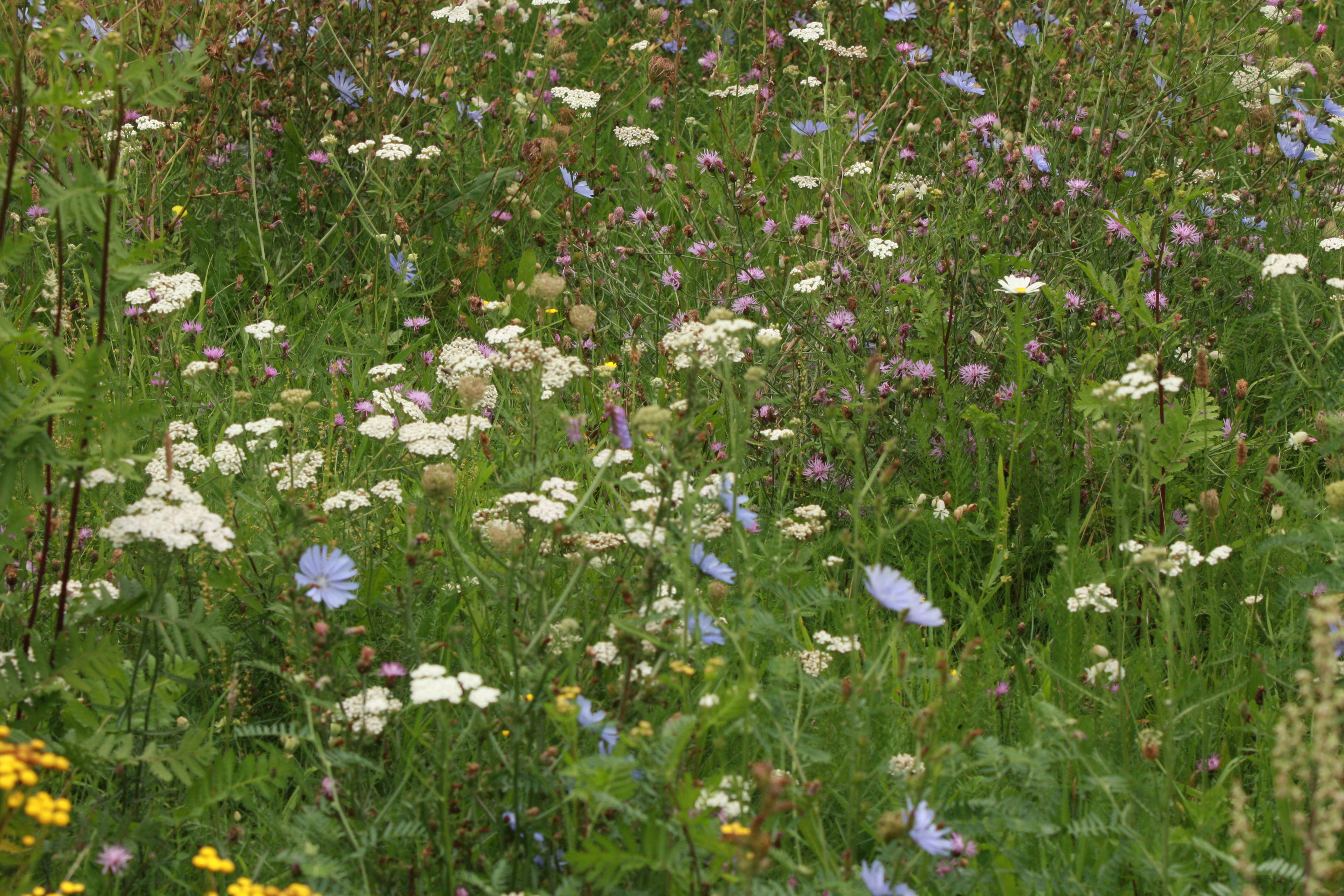 So bleibt als ein Baustein zur Förderung von Artenvielfalt nur eine Einsaat mit regiozertifiziertem Saatgut für die Anreicherung unserer Weiden mit Kräutern wie Wiesen-Flockenblume, Margerite, Wegwarte, Wilder Möhre, Lichtnelke oder verschiedenen Gräsern wie Schafschwingel oder Ruchgras. Neben offenen Boden- oder Wildschweinstellen, in denen wir Saatgut eingebracht haben, hat sich vor zwei Jahren eine ca. 2000qm große Fläche angeboten für eine vollständige Neuansaat. Diese „Einsaatfläche“ soll als Quelle für die anderen Flächen fungieren. Teilweise wandern die Pflanzen von allein auf die anderen Weiden beispielsweise durch die Verbreitung der Samen durch Wind (z.B. Löwenzahn), Ameisen (z.B. Wiesen-Flockenblume) oder Ausläufer (z.B. Margerite).