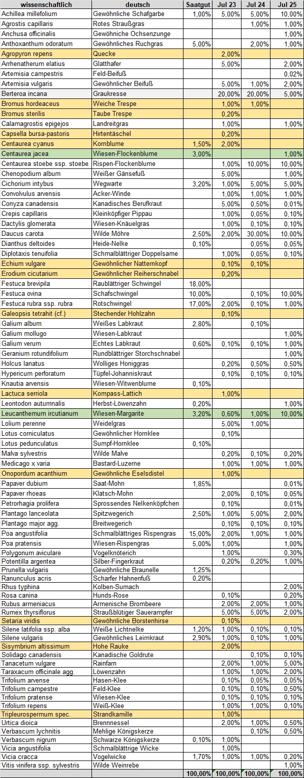 Aber eine Tendenz ist ablesbar, so hat sich der Anteil der Graukresse sowie Arten der nährstoffreichen Äcker und Unkrautfluren reduziert und gewünschte Arten der Wiesen und Weiden sind dazugekommen. Orange markiert sind Arten die laut FloraWeb der Formation der nährstoffreichen Stauden- und ausdauernden Unkrautfluren und/oder Äcker sowie kurzlebige Unkrautfluren zugeordnet sind und im dritten Jahr der Pflege mit zweimaliger Mahd verschwunden sind. Grün markiert sind Arten der Frischwiesen und -weiden, die im Saatgut waren und sich etablieren konnten.