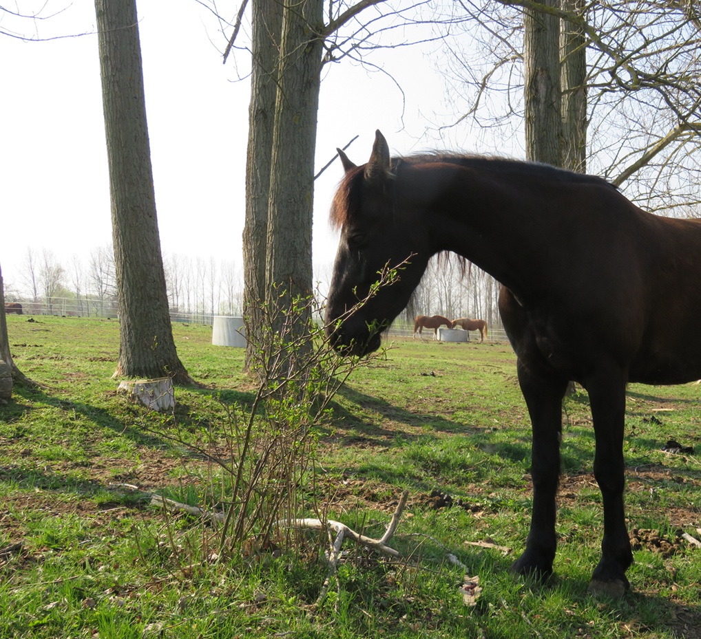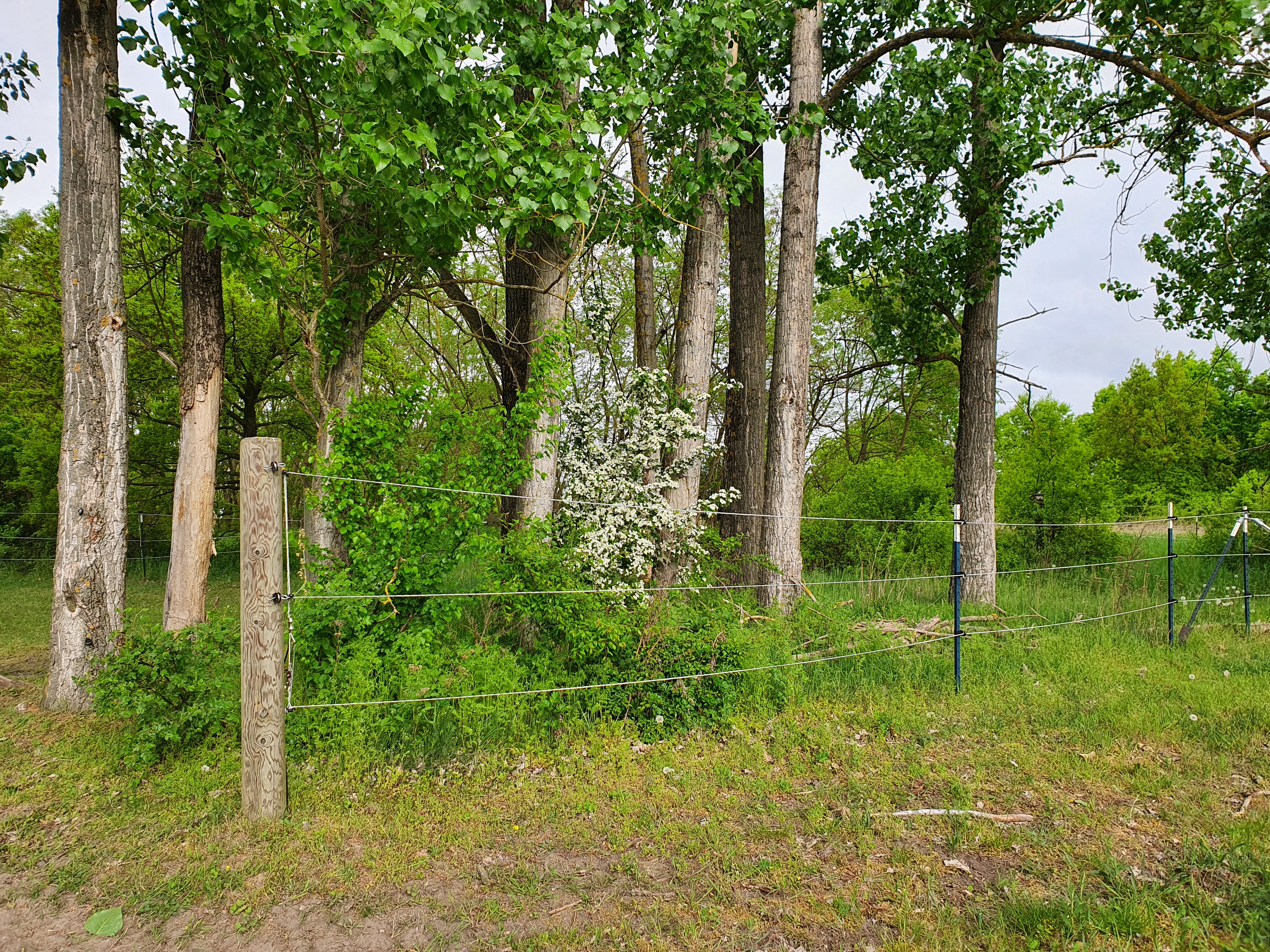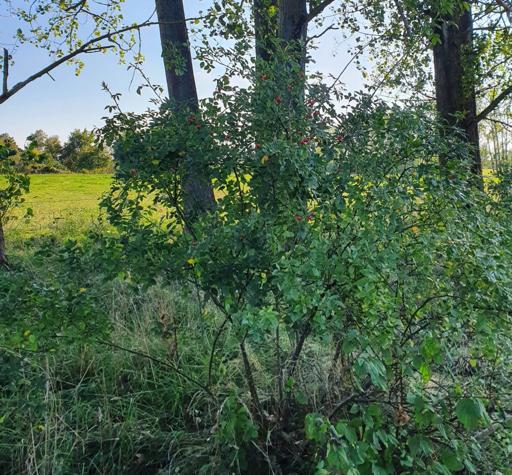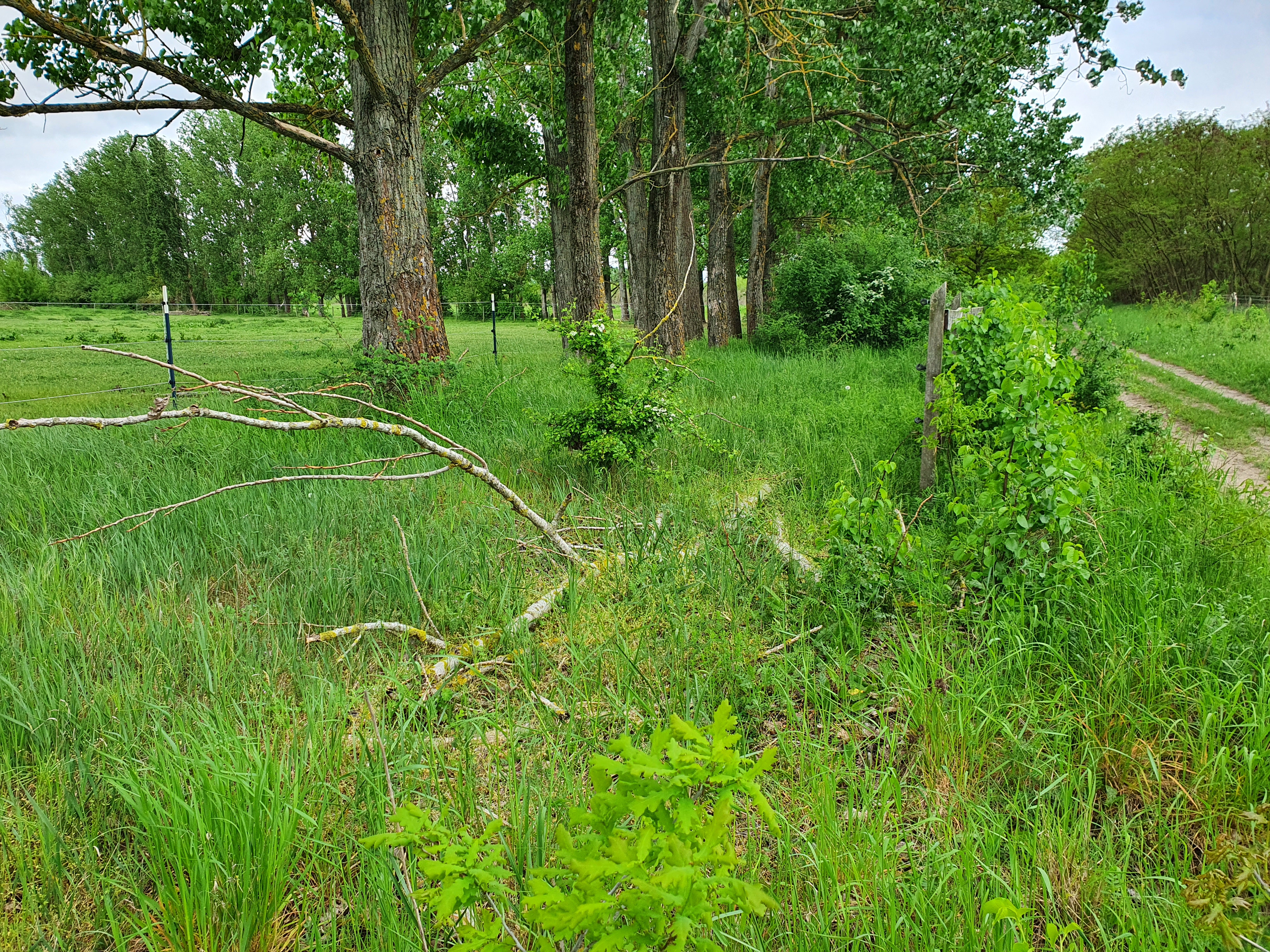 Eine kostengünstige Alternative dazu ist der „Zaun vor dem Zaun„, d.h. einen Streifen auszäunen, in dem sich Gehölze in Form von Naturverjüngung von selbst etablieren. Wir mussten im Frühjahr 2022 einen zweiten Zaun vor den anderen setzen, weil immer wieder Spaziergänger unsere Pferde gefüttert haben. Außerdem war der alte Holzzaun schon marode, nicht mehr zu erhalten und die Pappeln wurden von den Pferden geschält. Es ist faszinierend und beeindruckend, wie schnell in diesem Streifen eine Gehölzentwicklung stattfindet. Es wachsen unter anderem Eichen, Weißdorn, Roter Hartriegel und Hundsrose auf – viel schneller und vitaler als in der gepflanzten Hecke am Reitplatz.